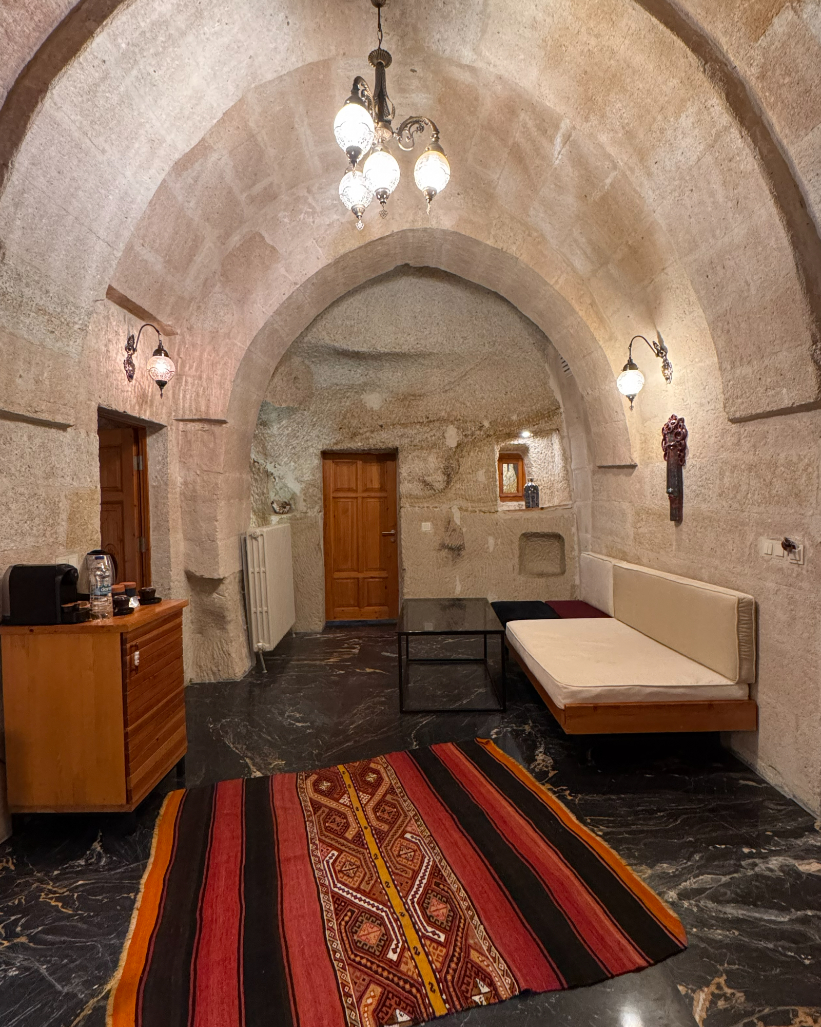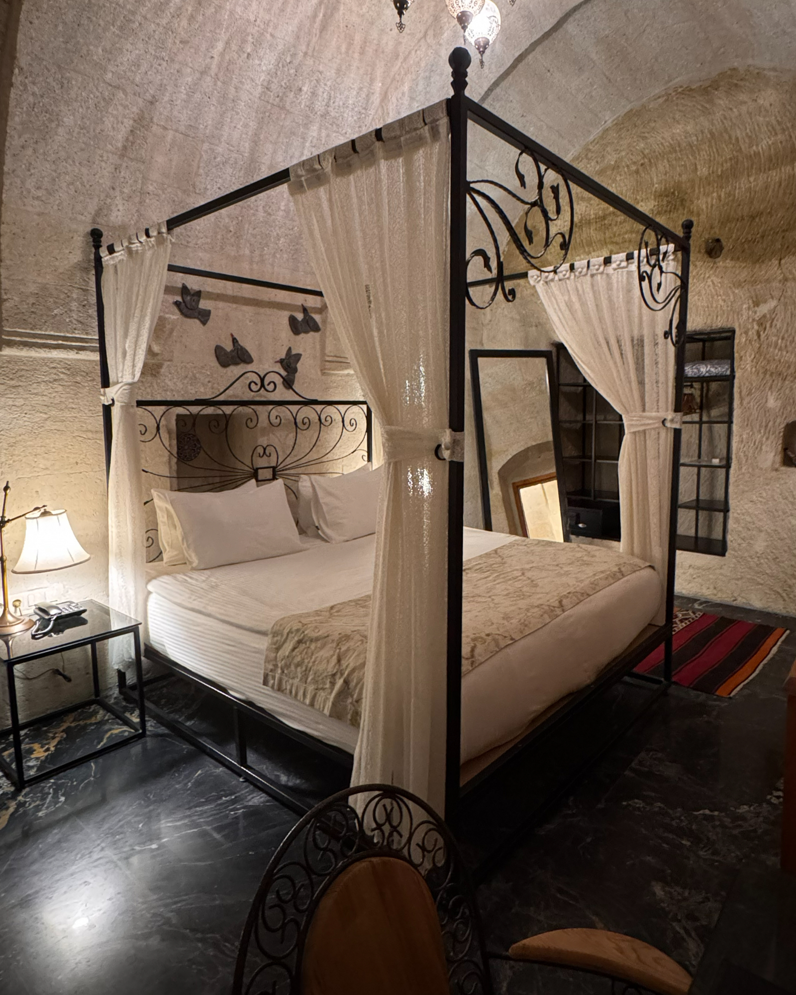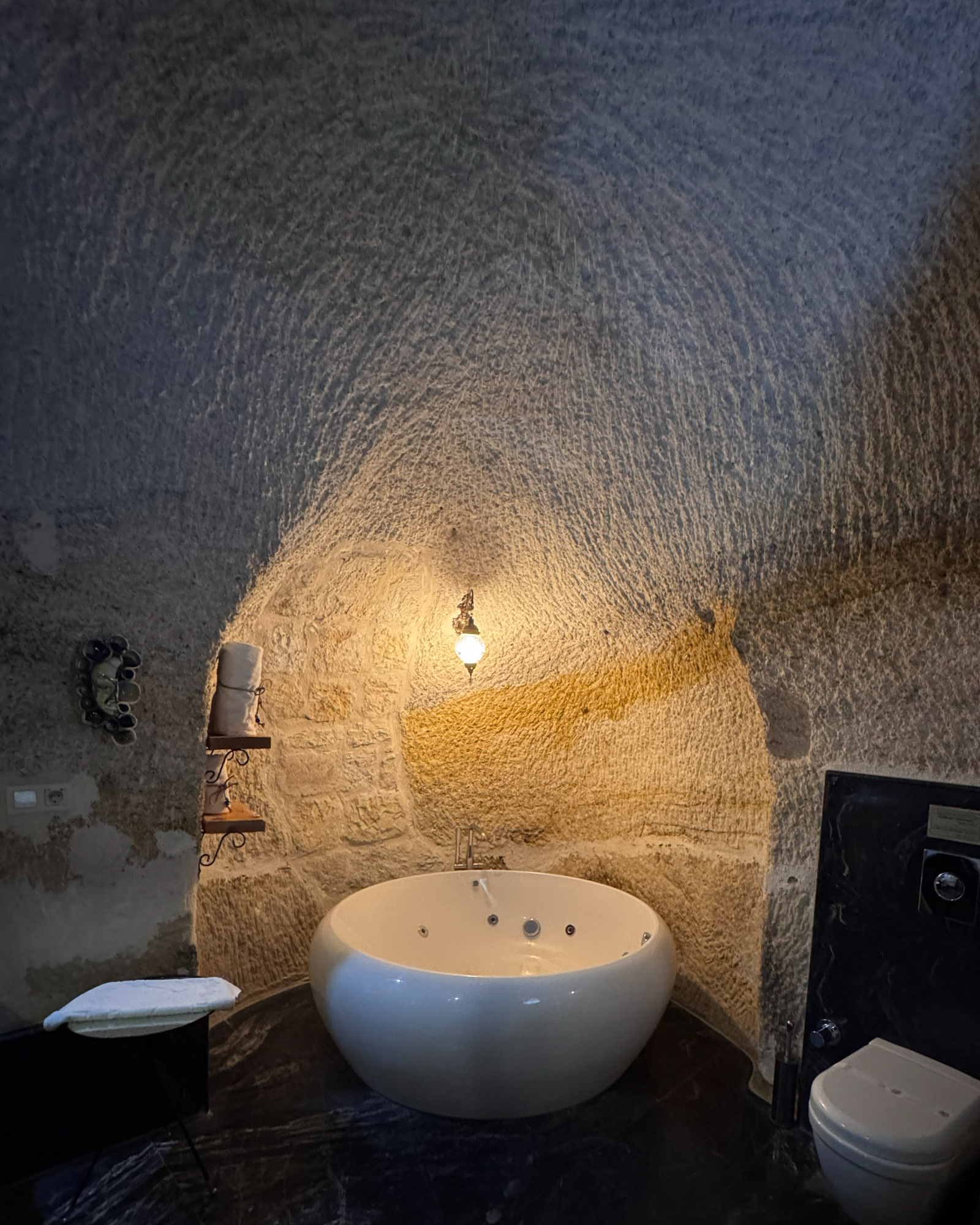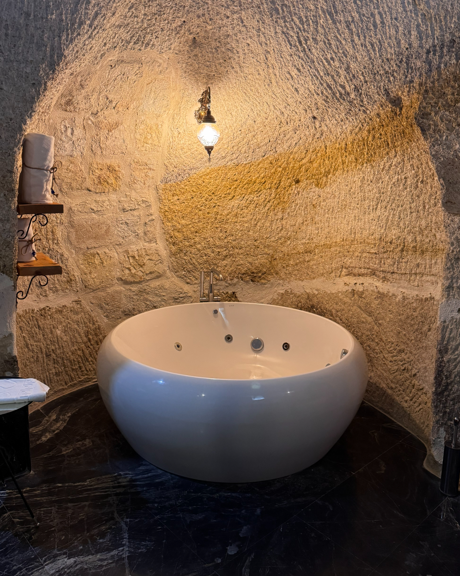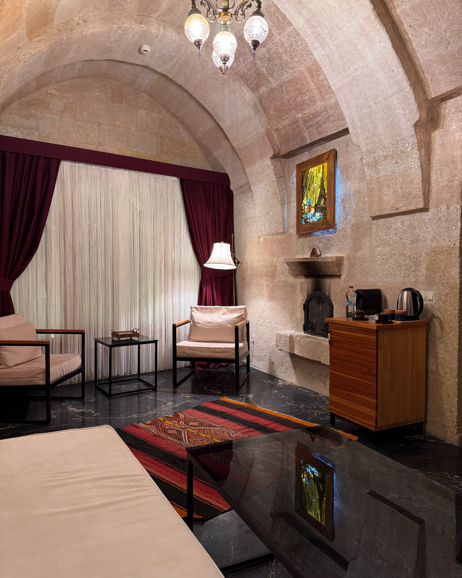 King Cave Suite, jakuzi, şömine ve Çavuşin Kalesi manzarası ile Kapadokya’da lüks ve özel bir süit deneyimi sunar.
