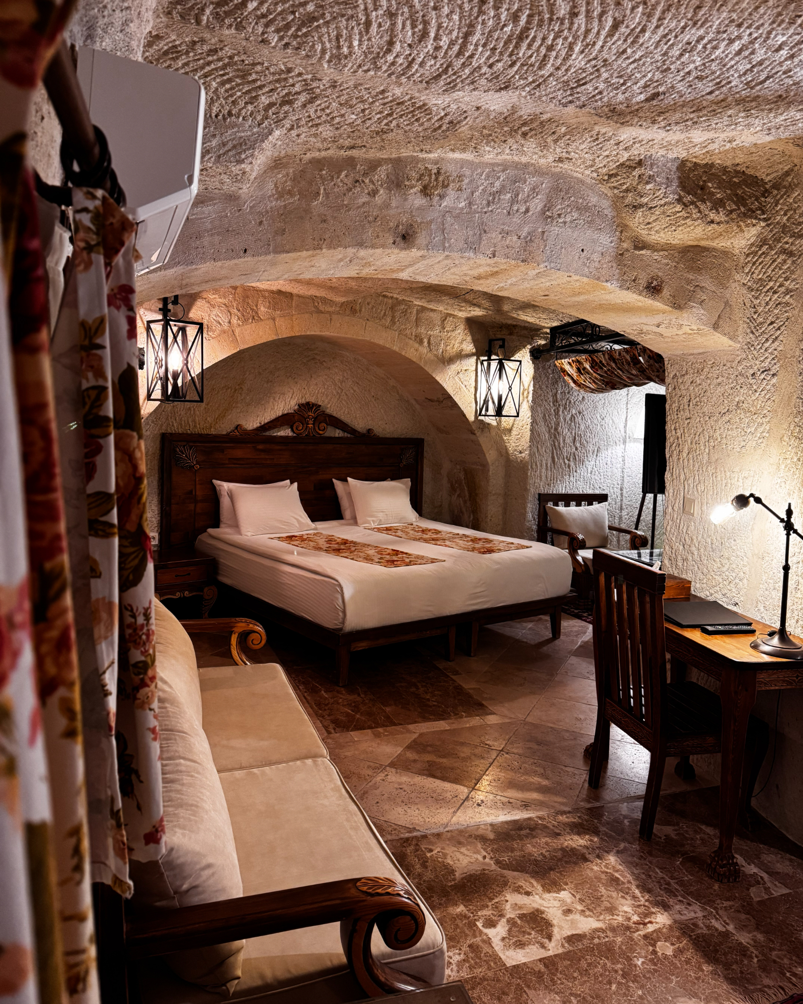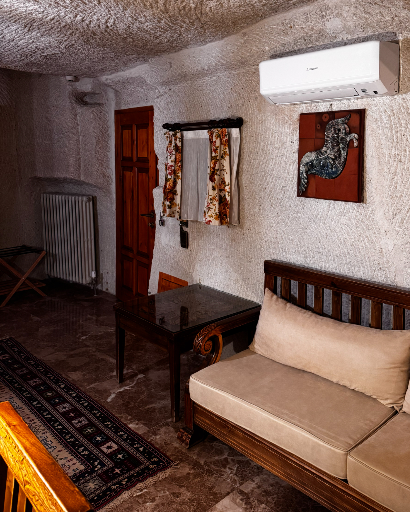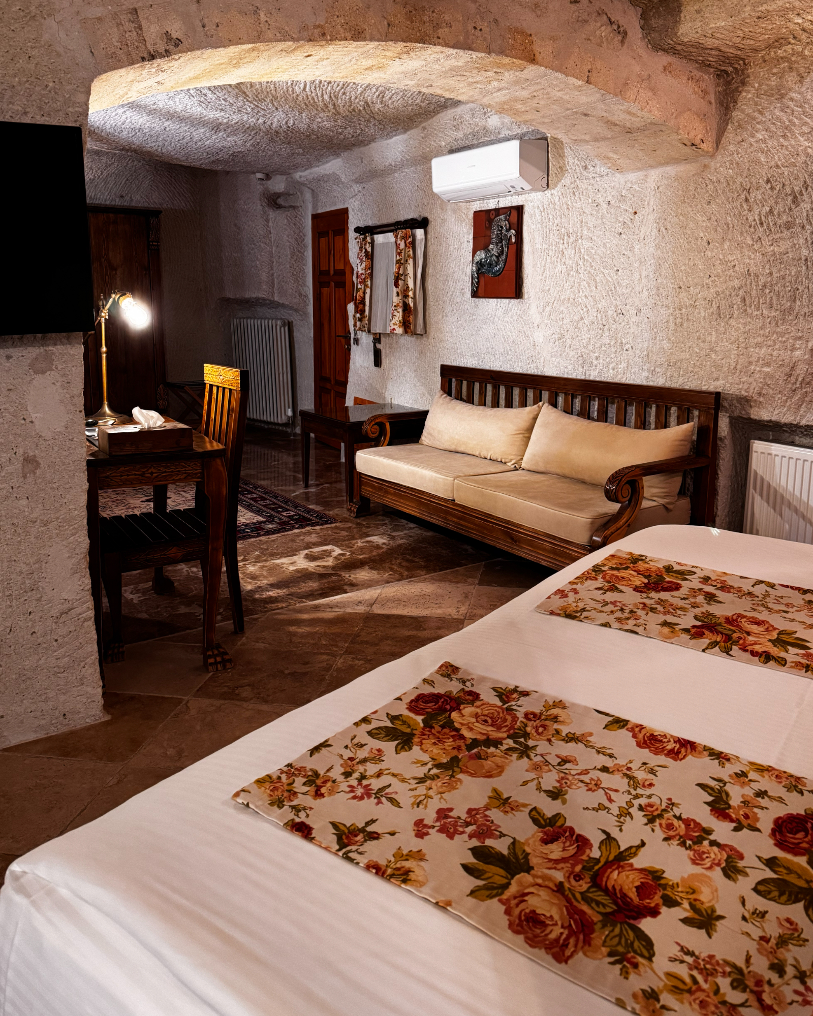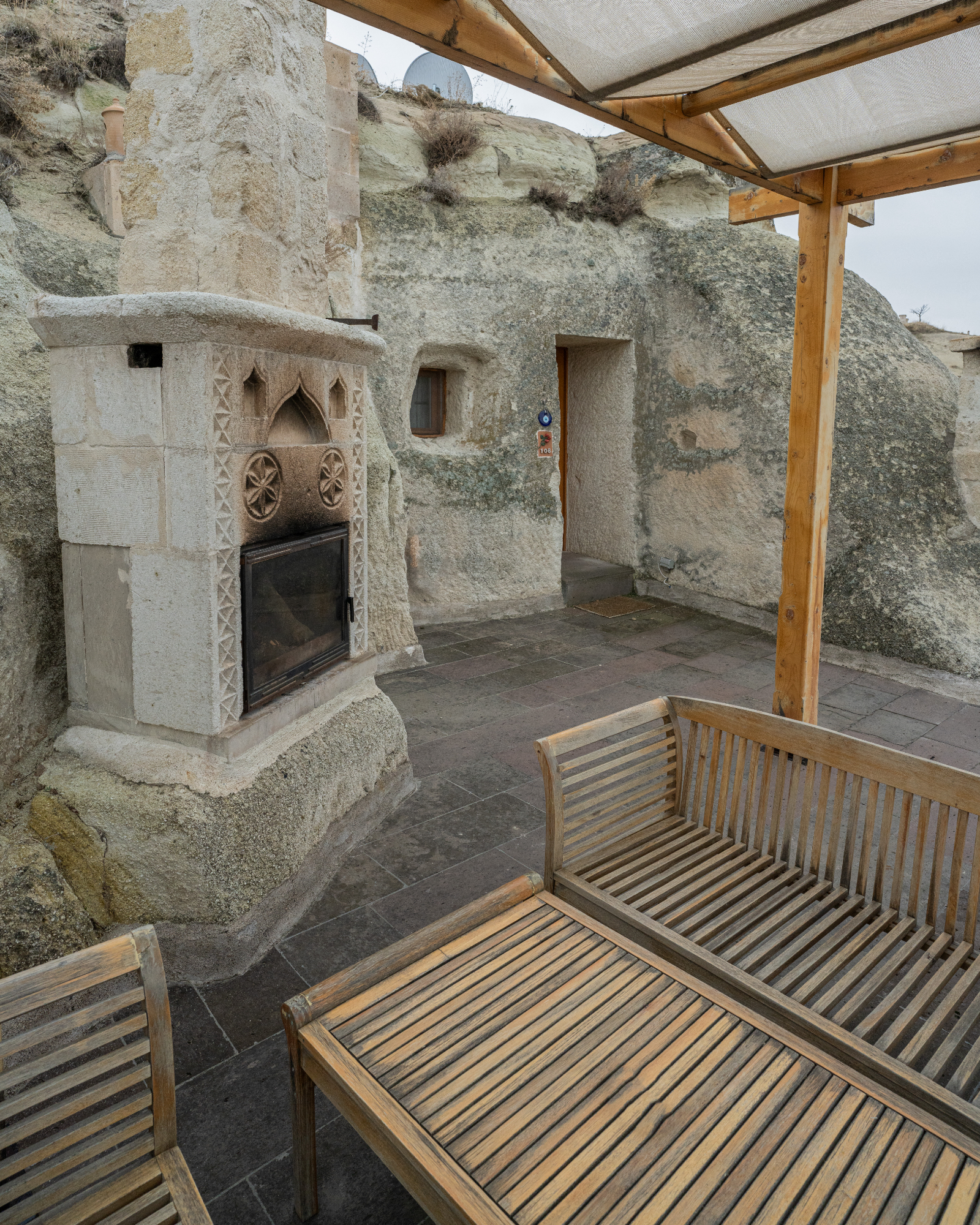 Superior Deluxe Room, teras şöminesi, mini Türk hamamı ve Kapadokya manzarası ile lüks ve otantik bir mağara oda deneyimi sunar.