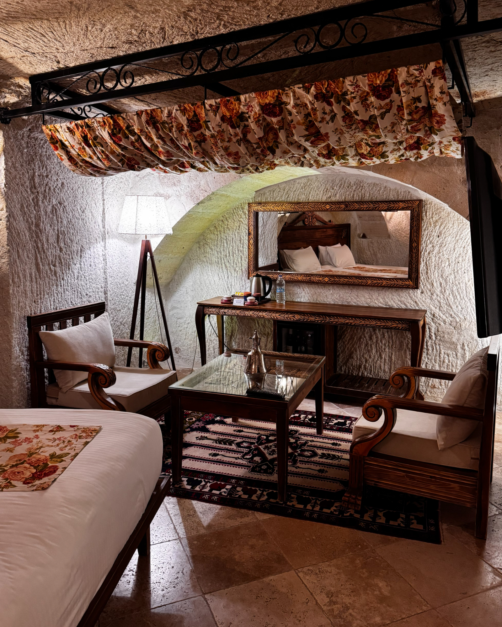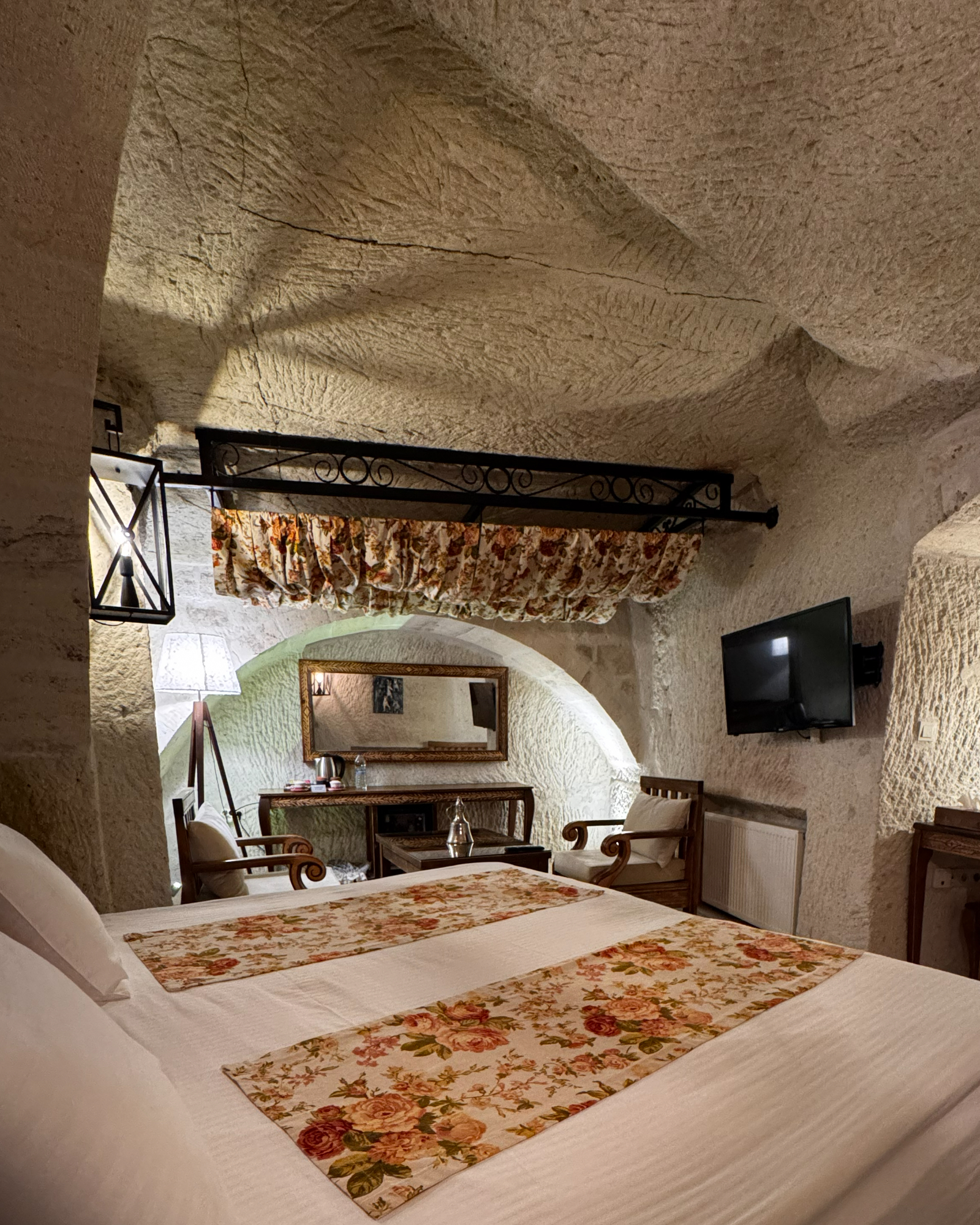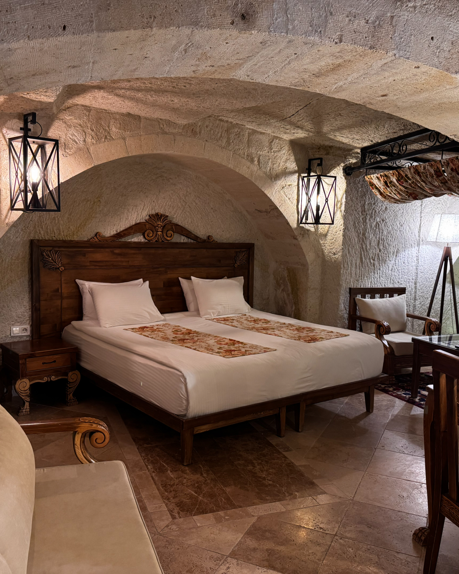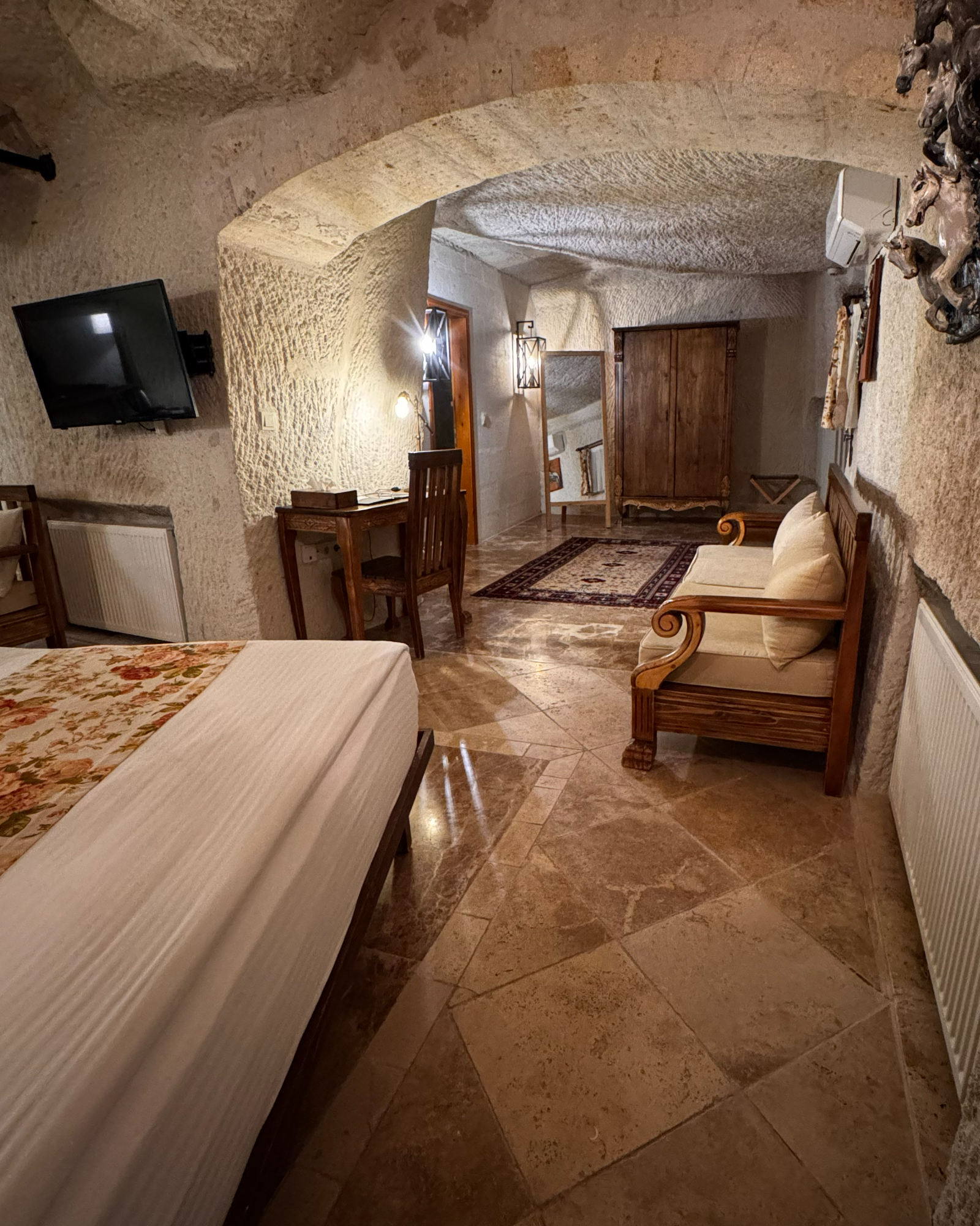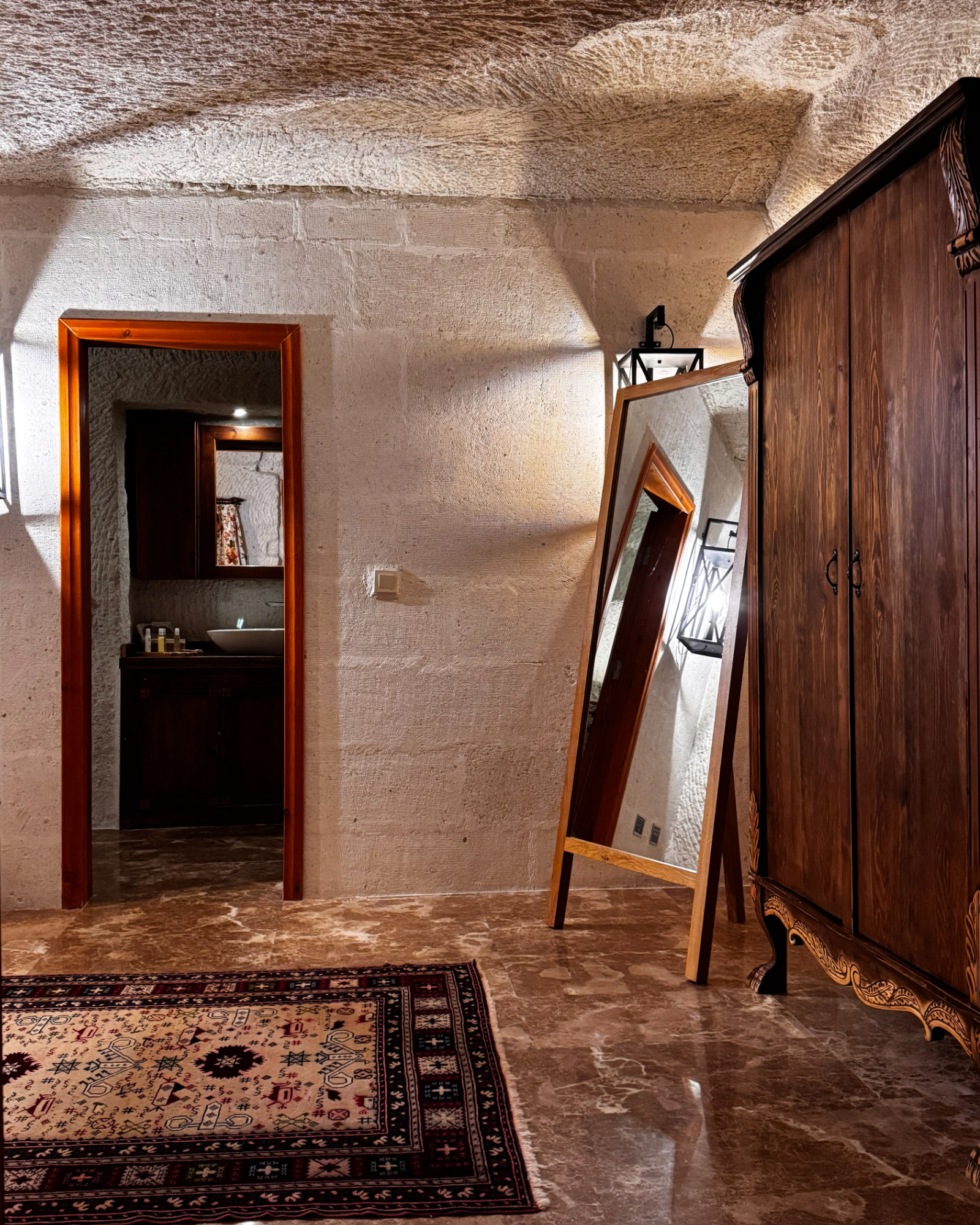 Superior Deluxe Room, teras şöminesi, mini Türk hamamı ve Kapadokya manzarası ile lüks ve otantik bir mağara oda deneyimi sunar.