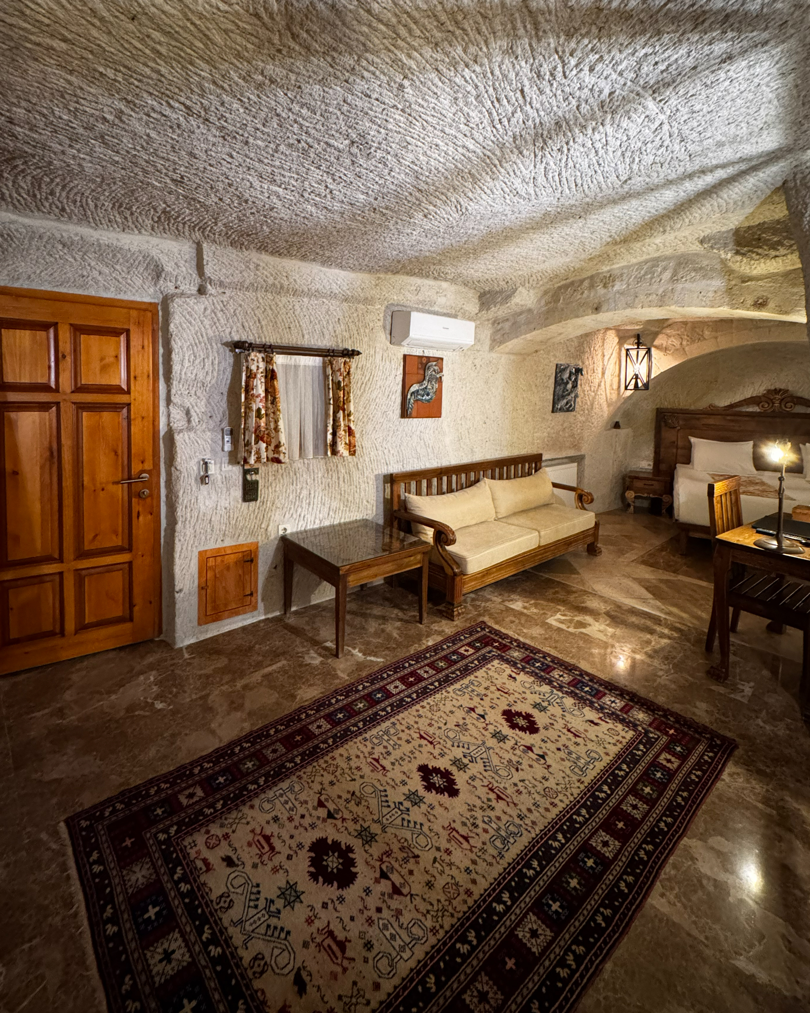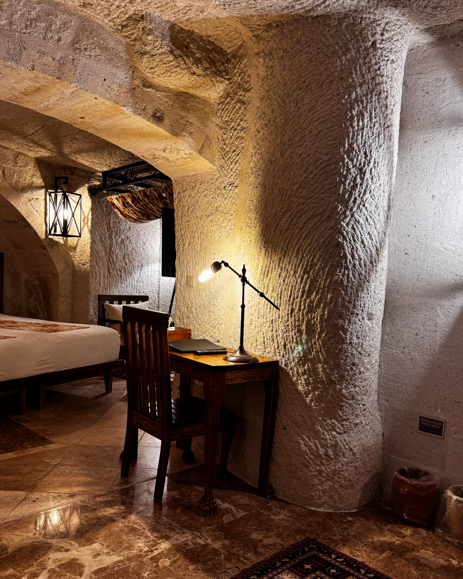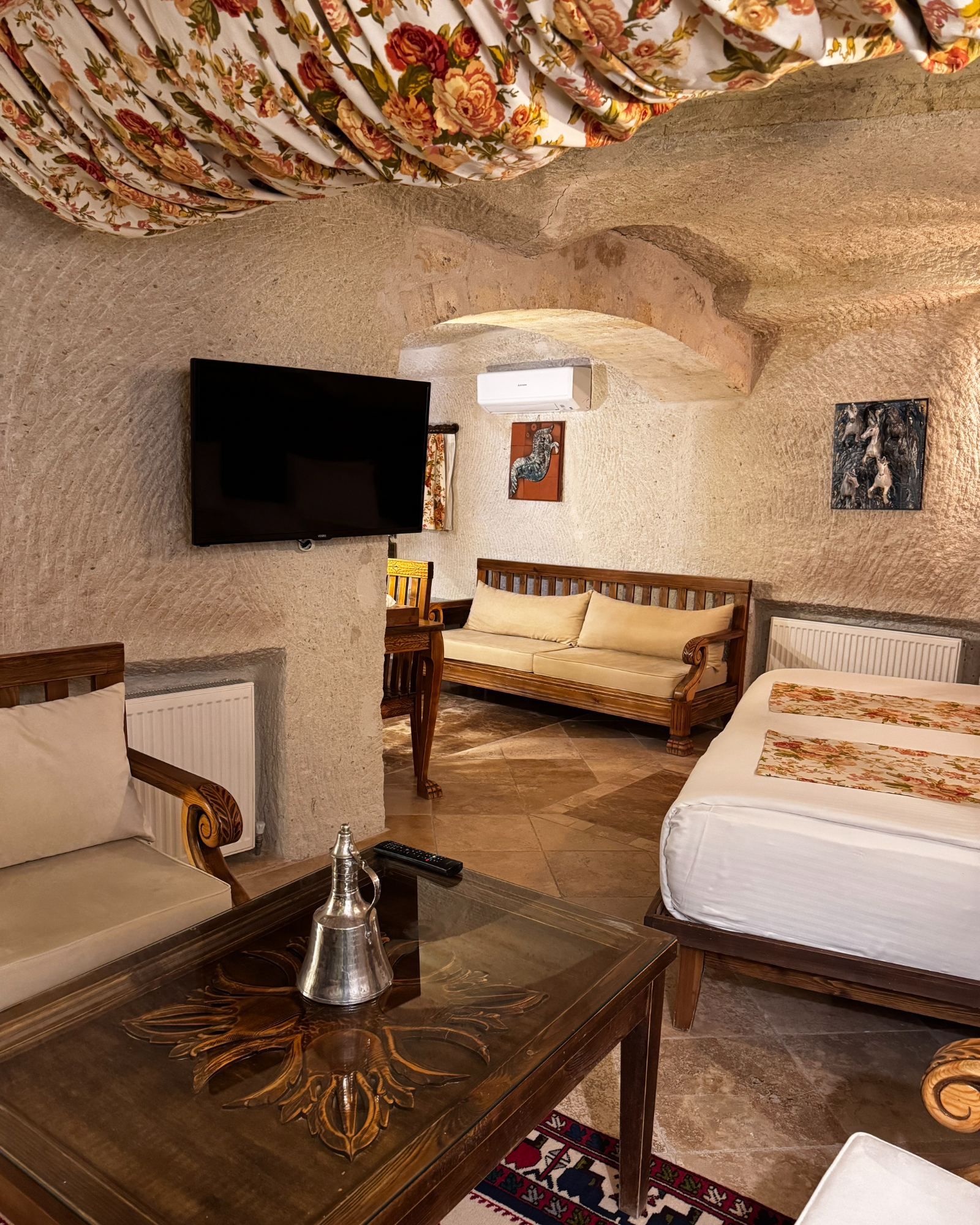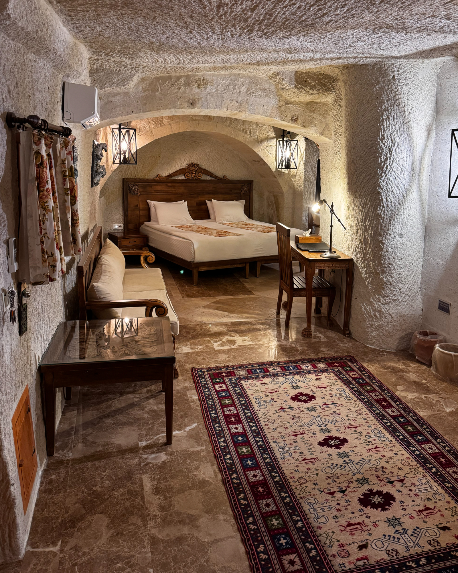 Superior Deluxe Room, teras şöminesi, mini Türk hamamı ve Kapadokya manzarası ile lüks ve otantik bir mağara oda deneyimi sunar.