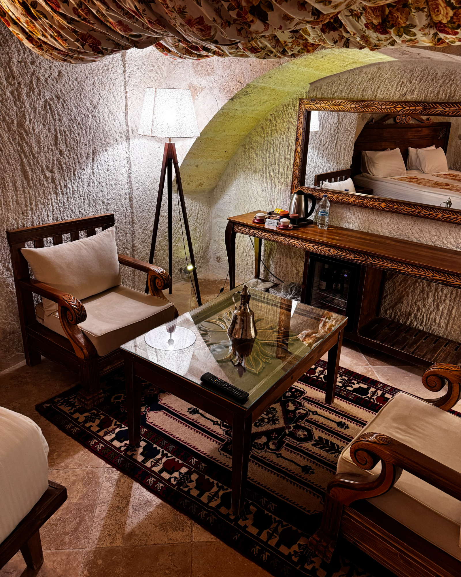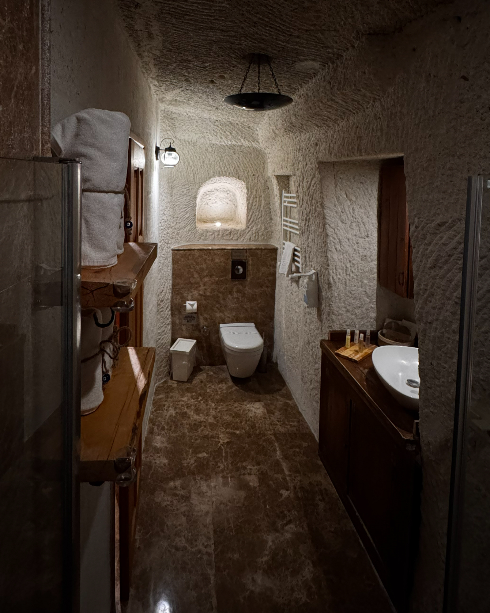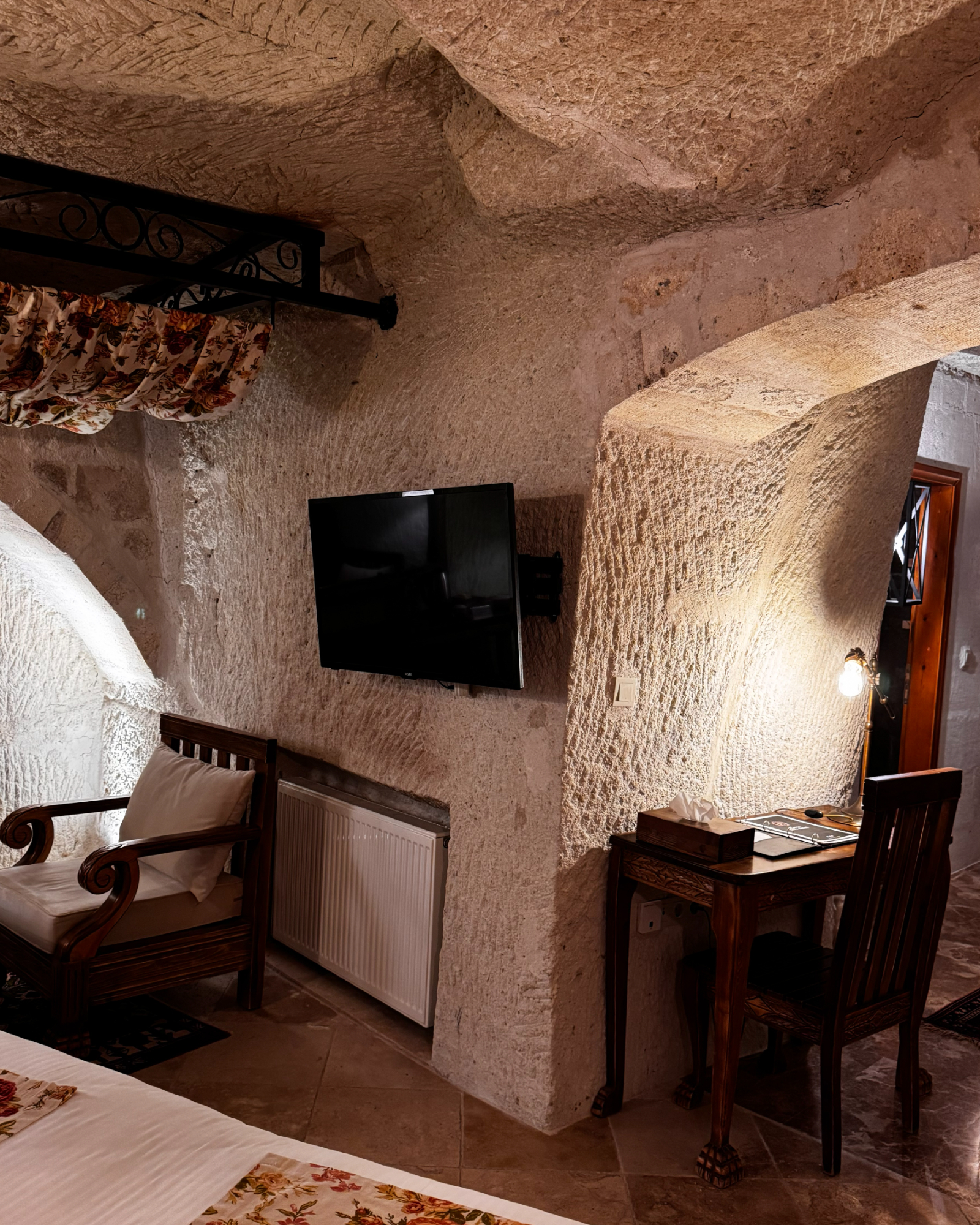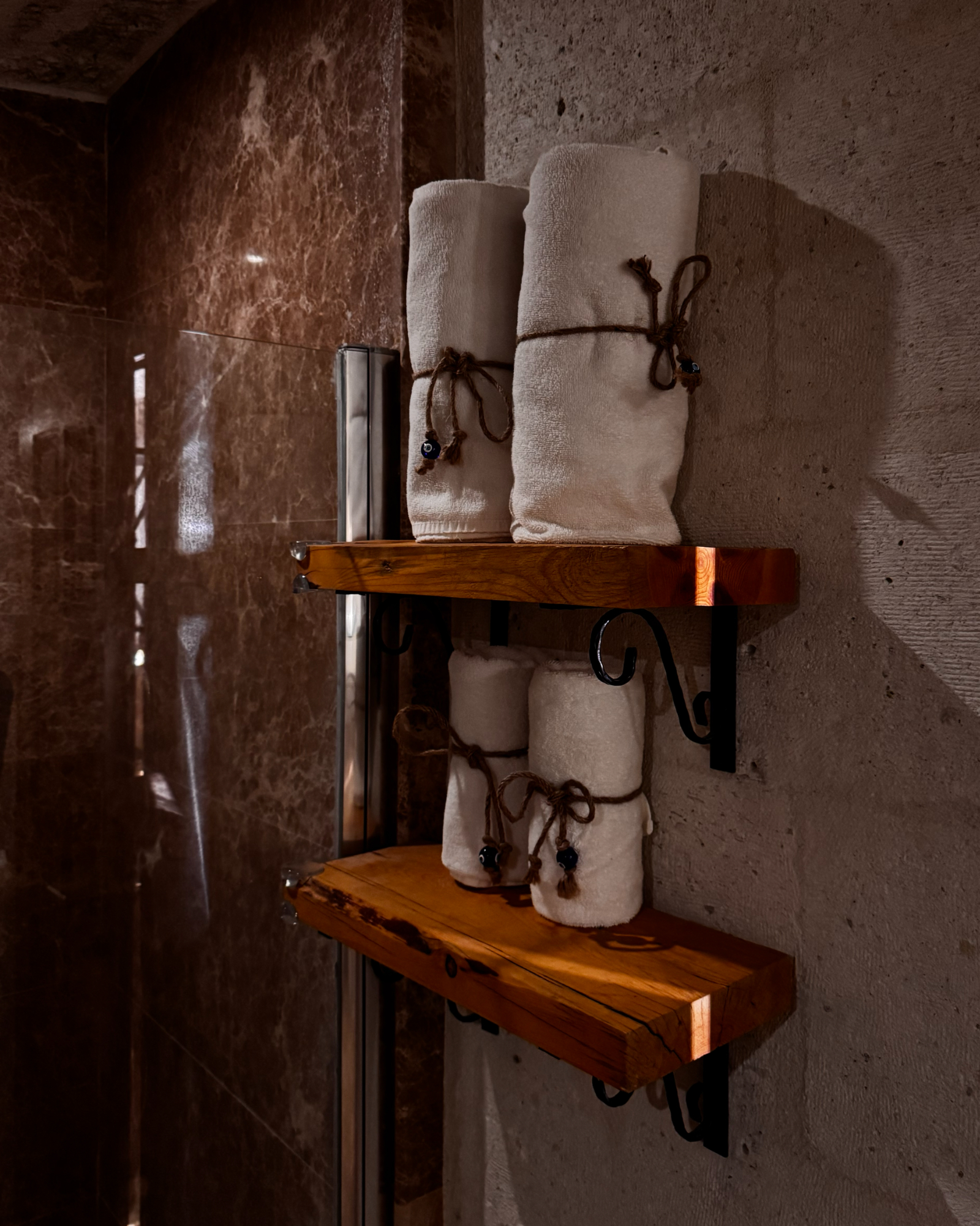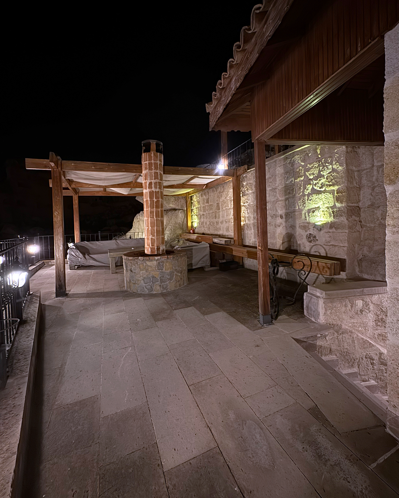 Superior Deluxe Room, teras şöminesi, mini Türk hamamı ve Kapadokya manzarası ile lüks ve otantik bir mağara oda deneyimi sunar.