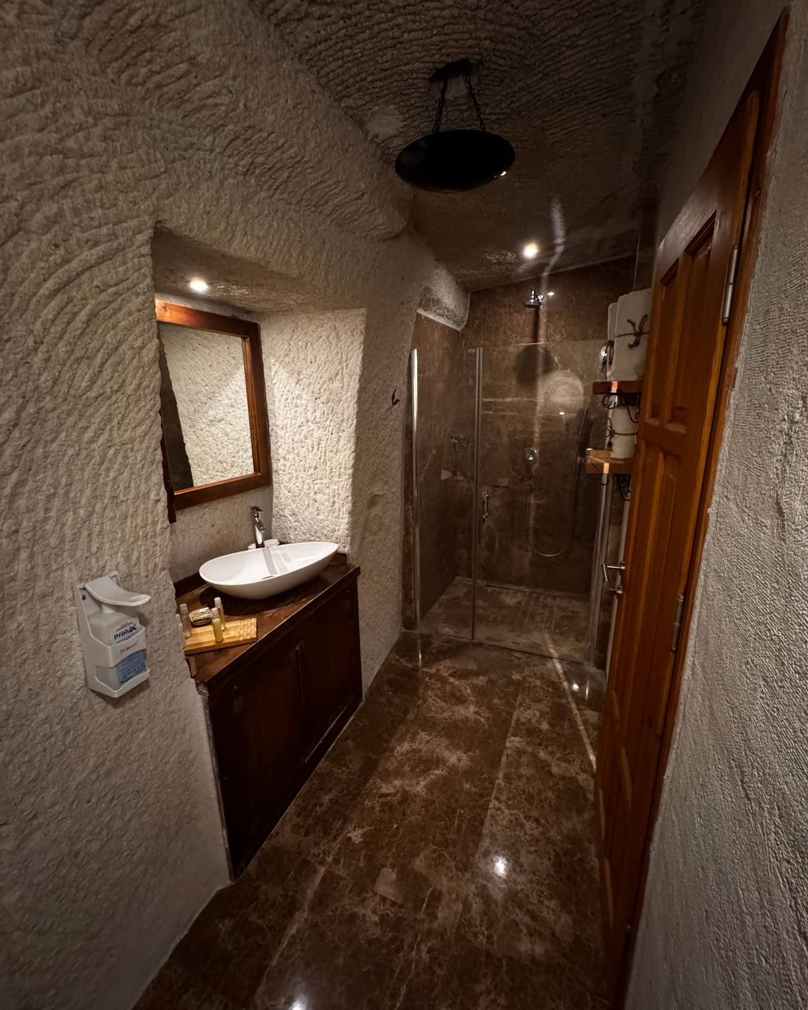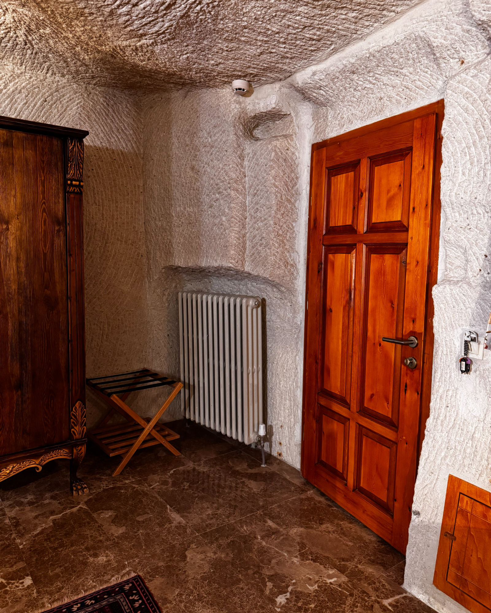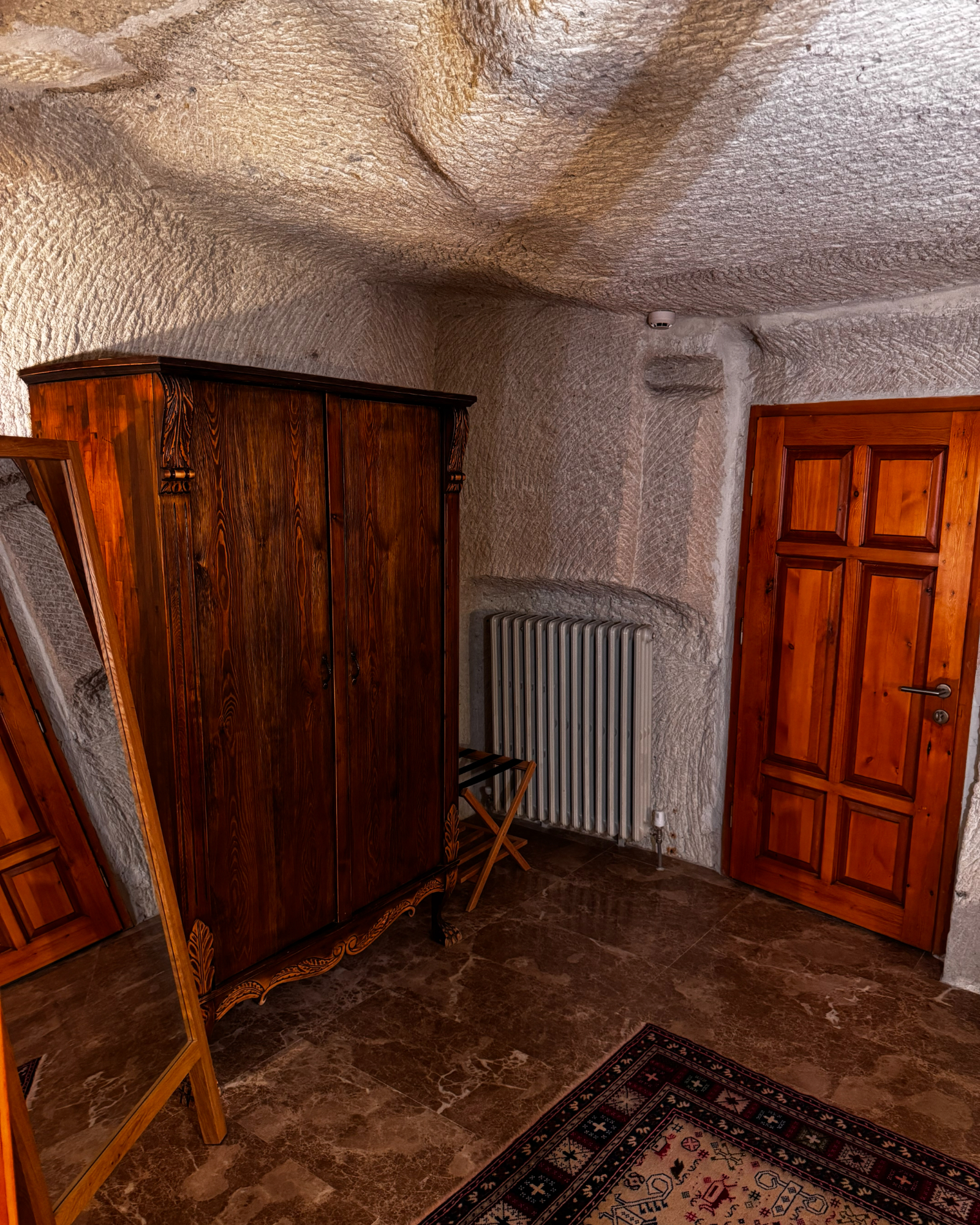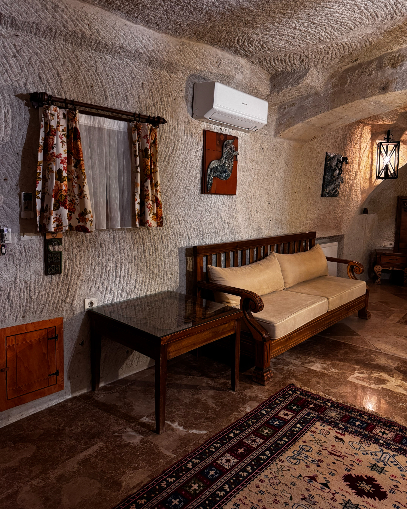 Superior Deluxe Room, teras şöminesi, mini Türk hamamı ve Kapadokya manzarası ile lüks ve otantik bir mağara oda deneyimi sunar.