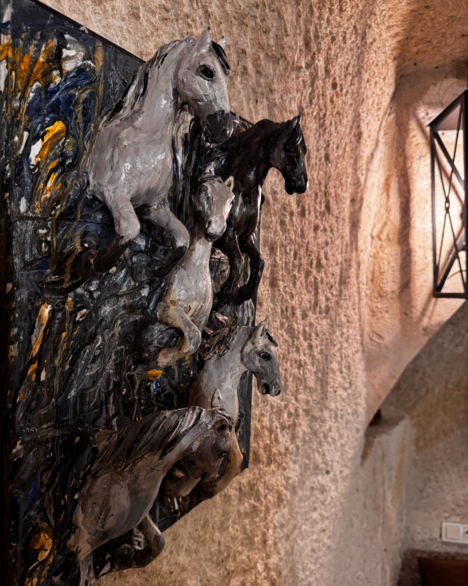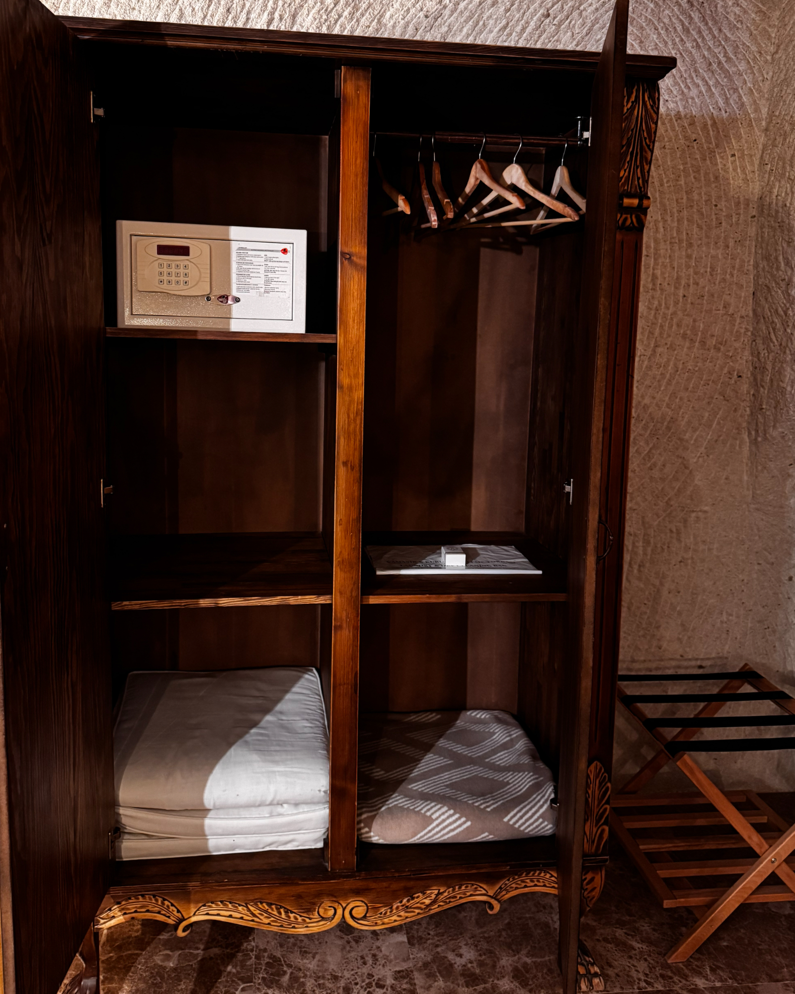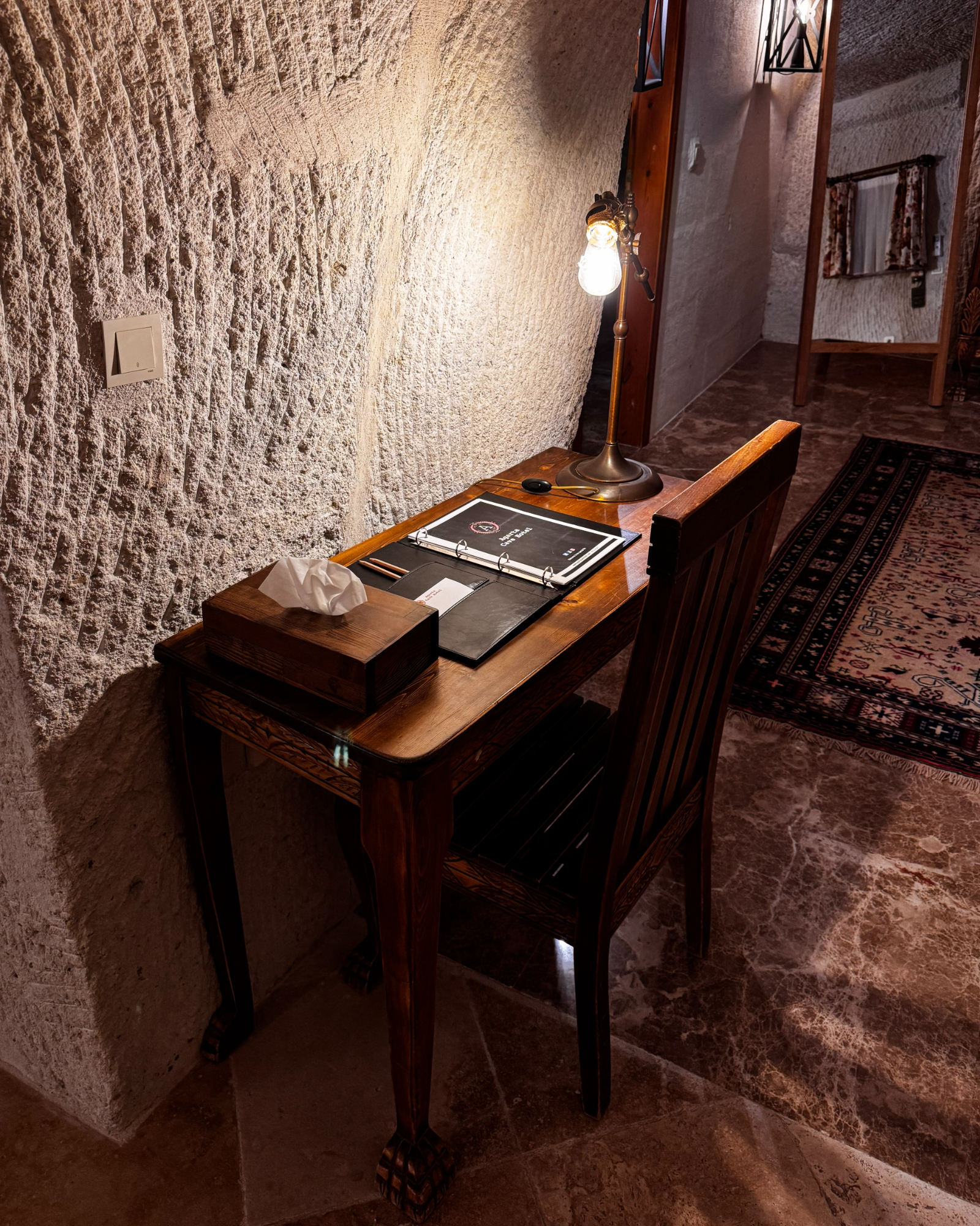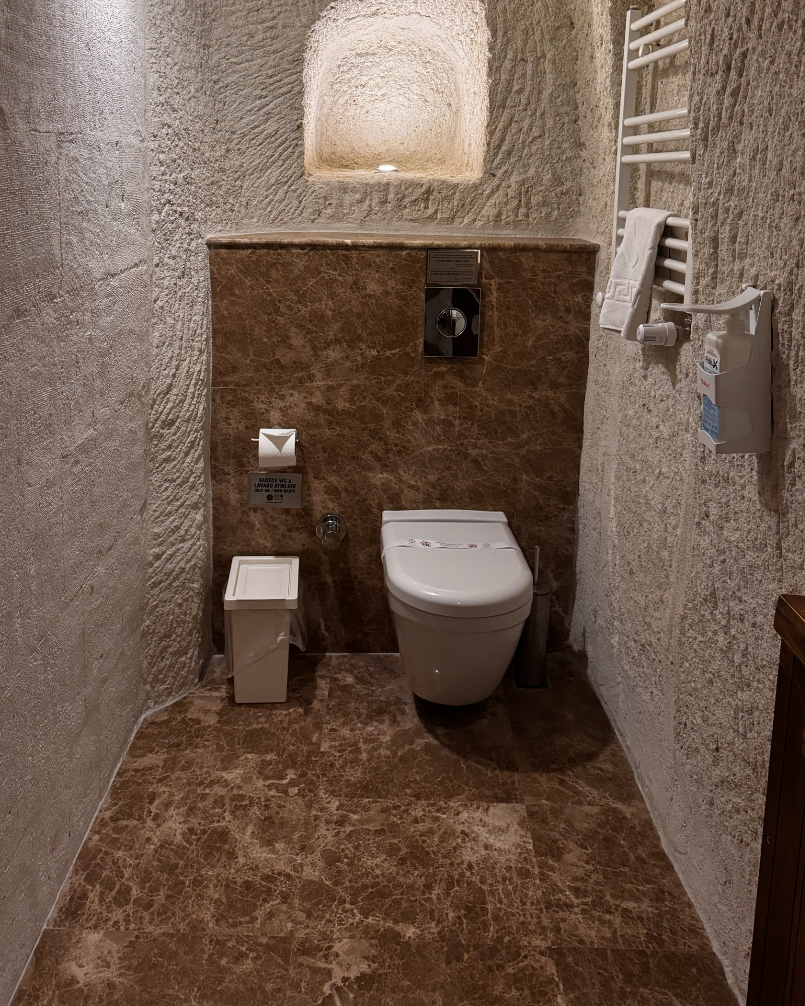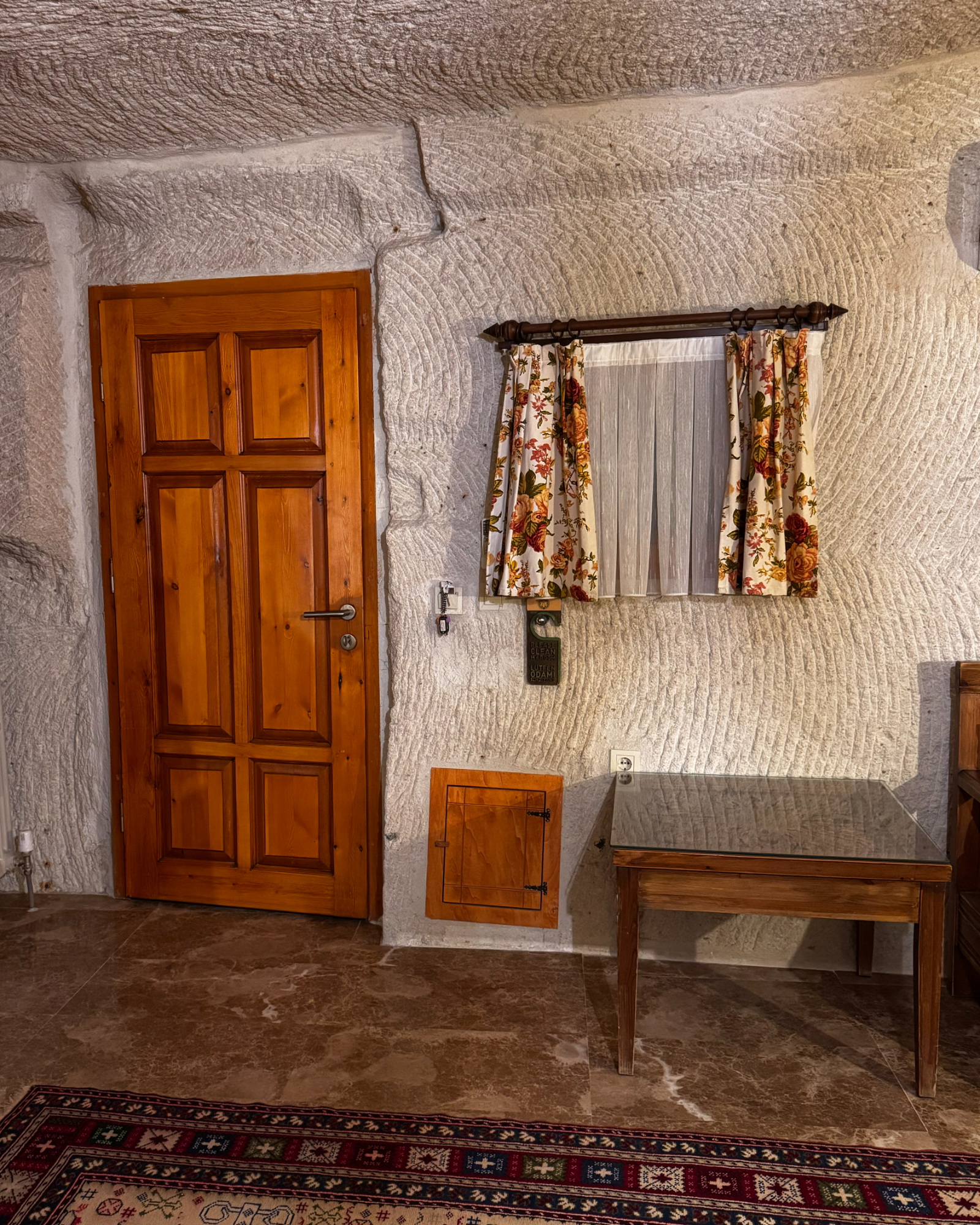 Superior Deluxe Room, teras şöminesi, mini Türk hamamı ve Kapadokya manzarası ile lüks ve otantik bir mağara oda deneyimi sunar.