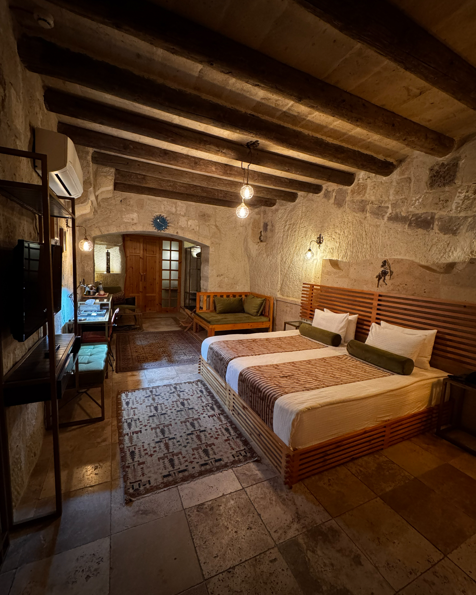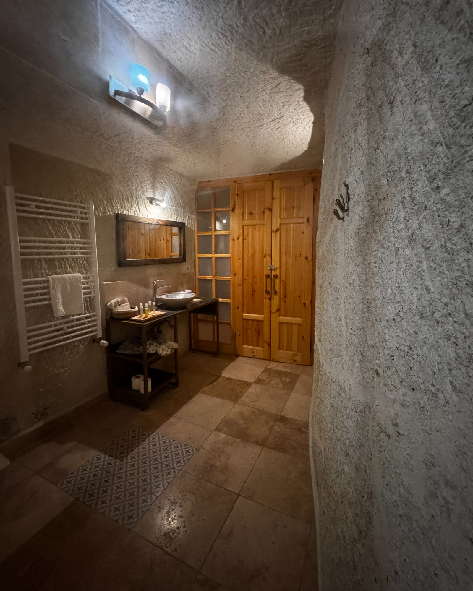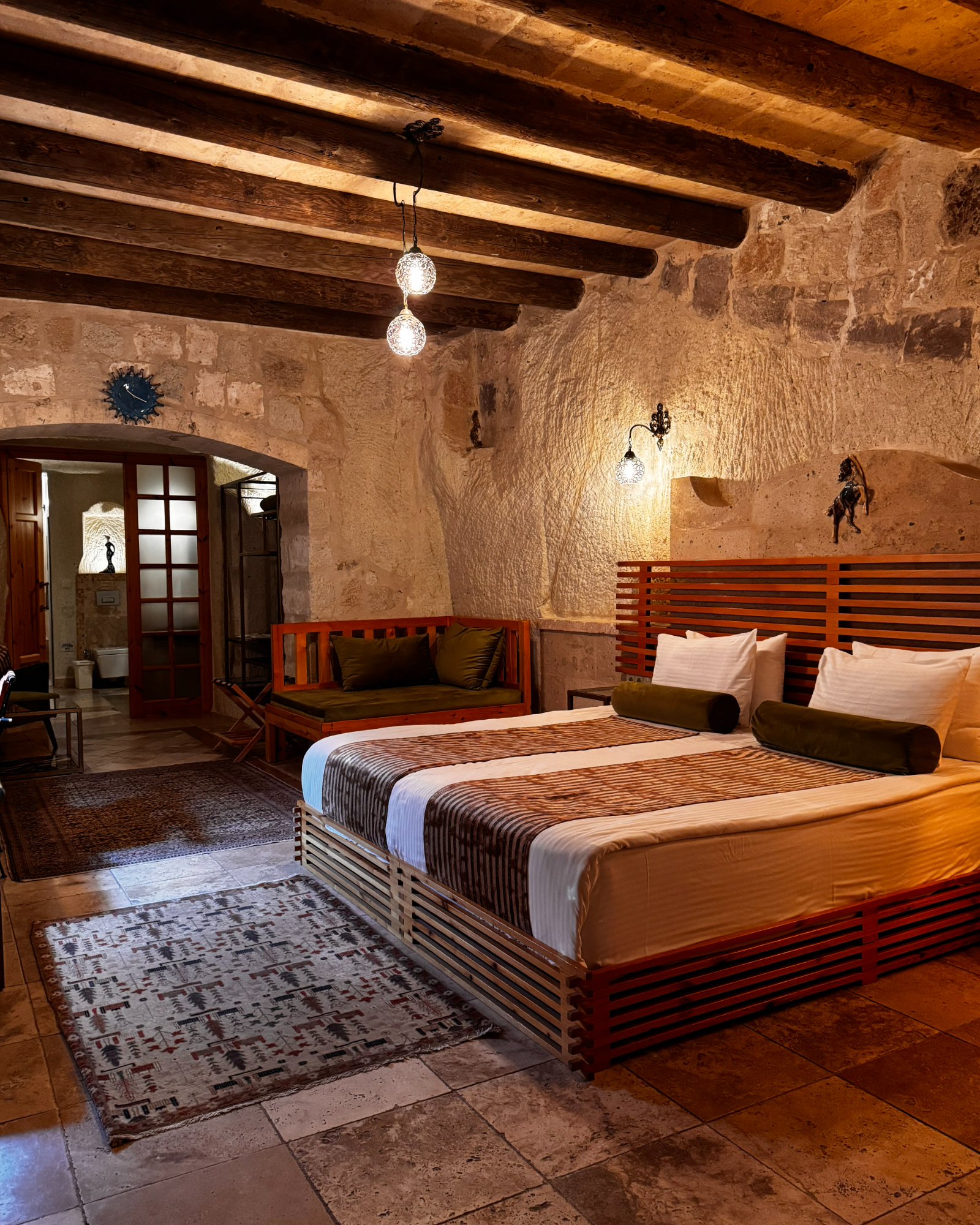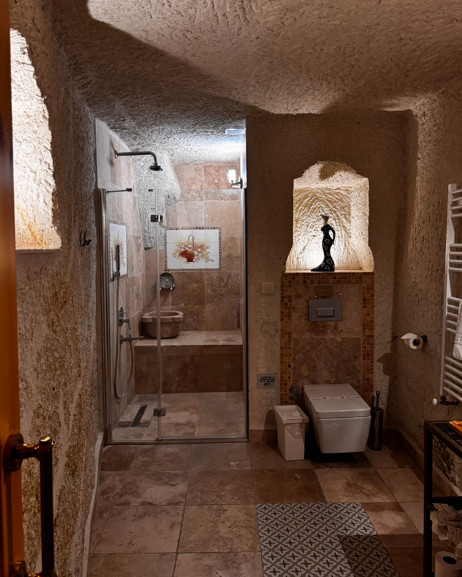 Superior Deluxe Room, teras şöminesi, mini Türk hamamı ve Kapadokya manzarası ile lüks ve otantik bir mağara oda deneyimi sunar.