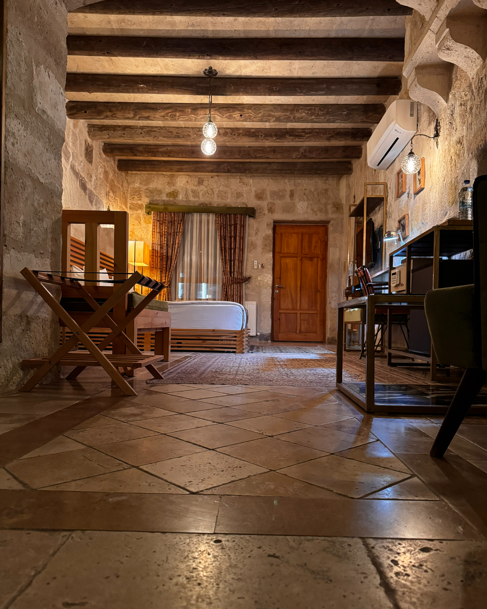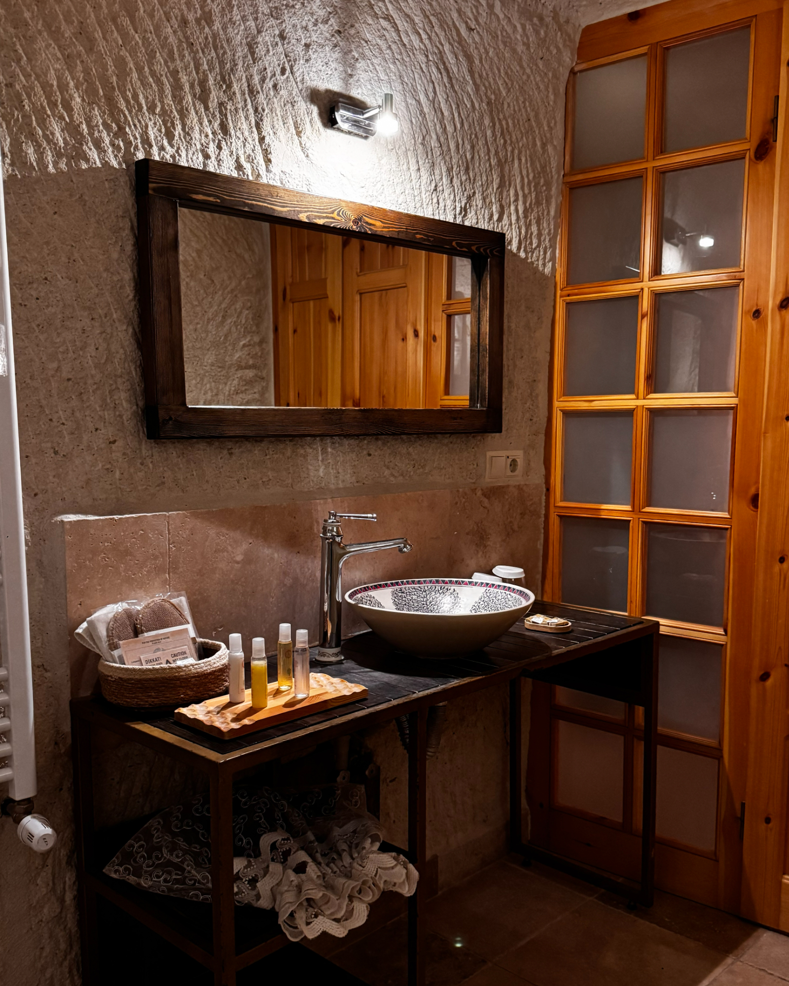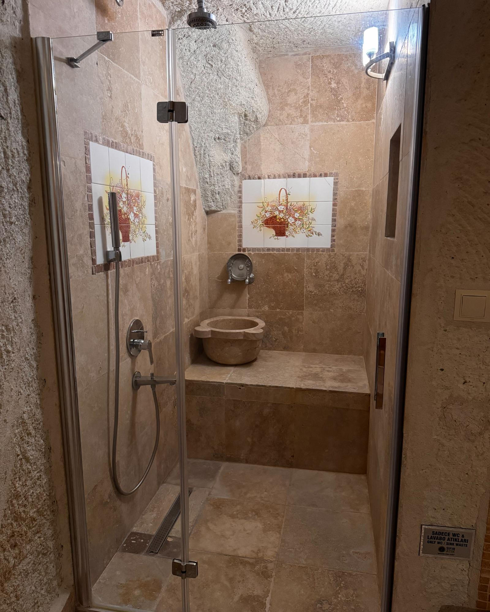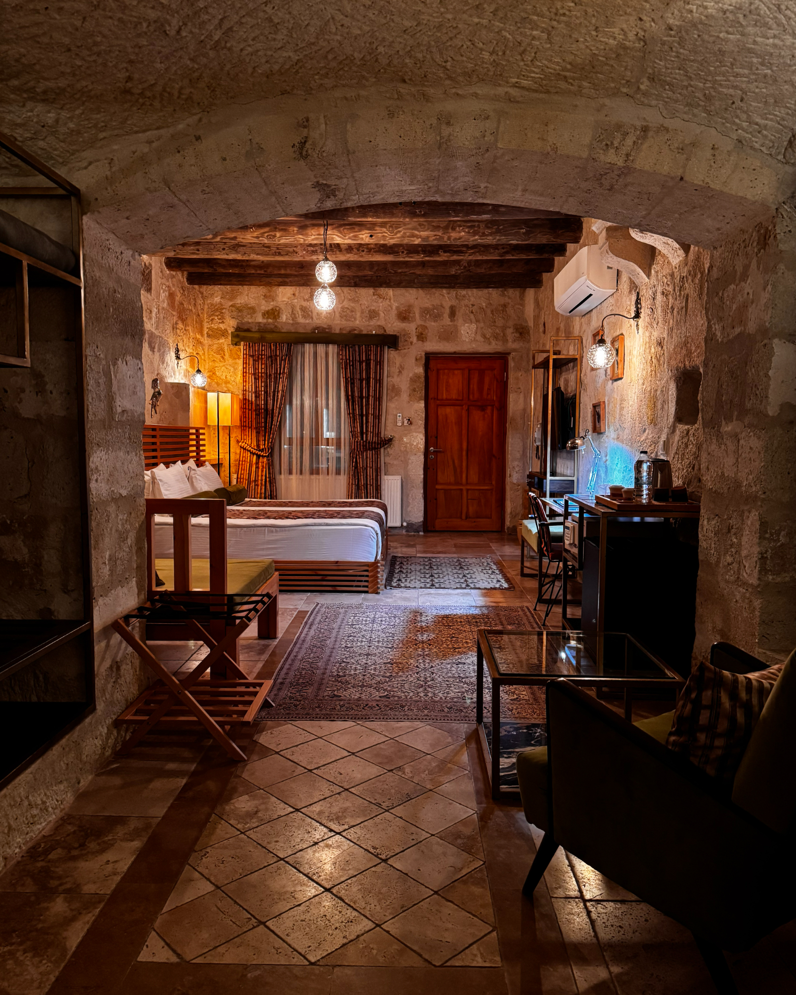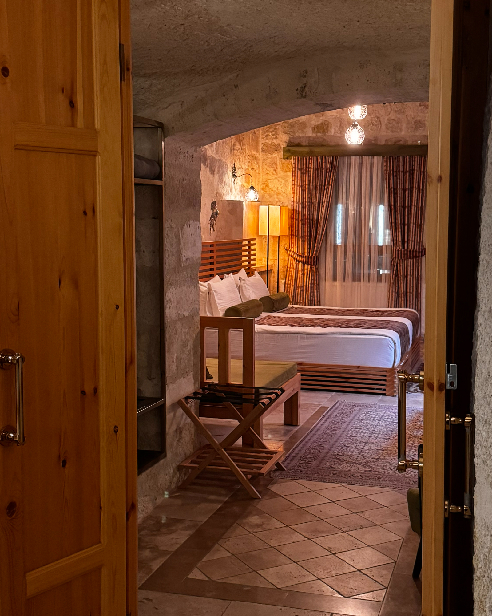 Superior Deluxe Room, teras şöminesi, mini Türk hamamı ve Kapadokya manzarası ile lüks ve otantik bir mağara oda deneyimi sunar.