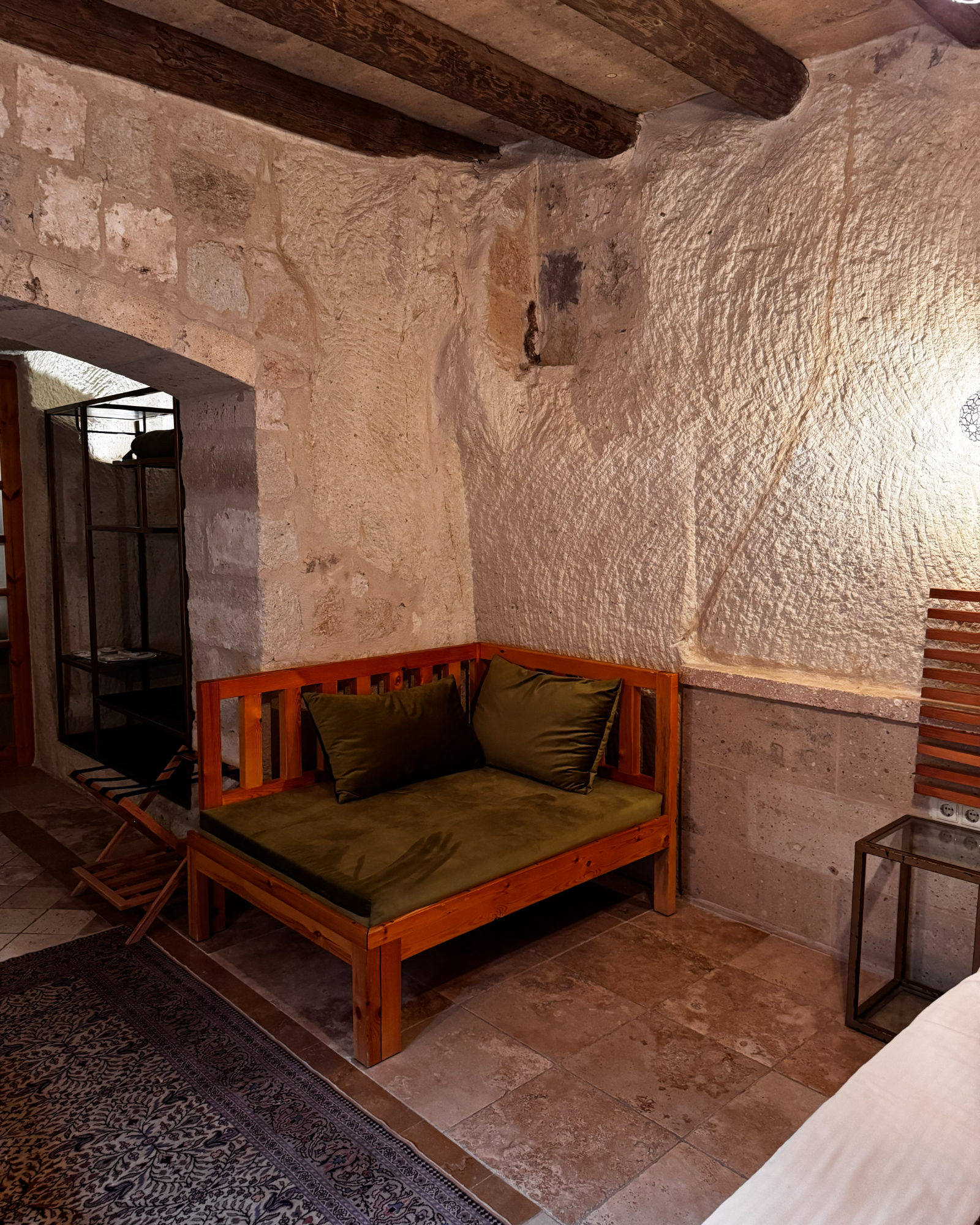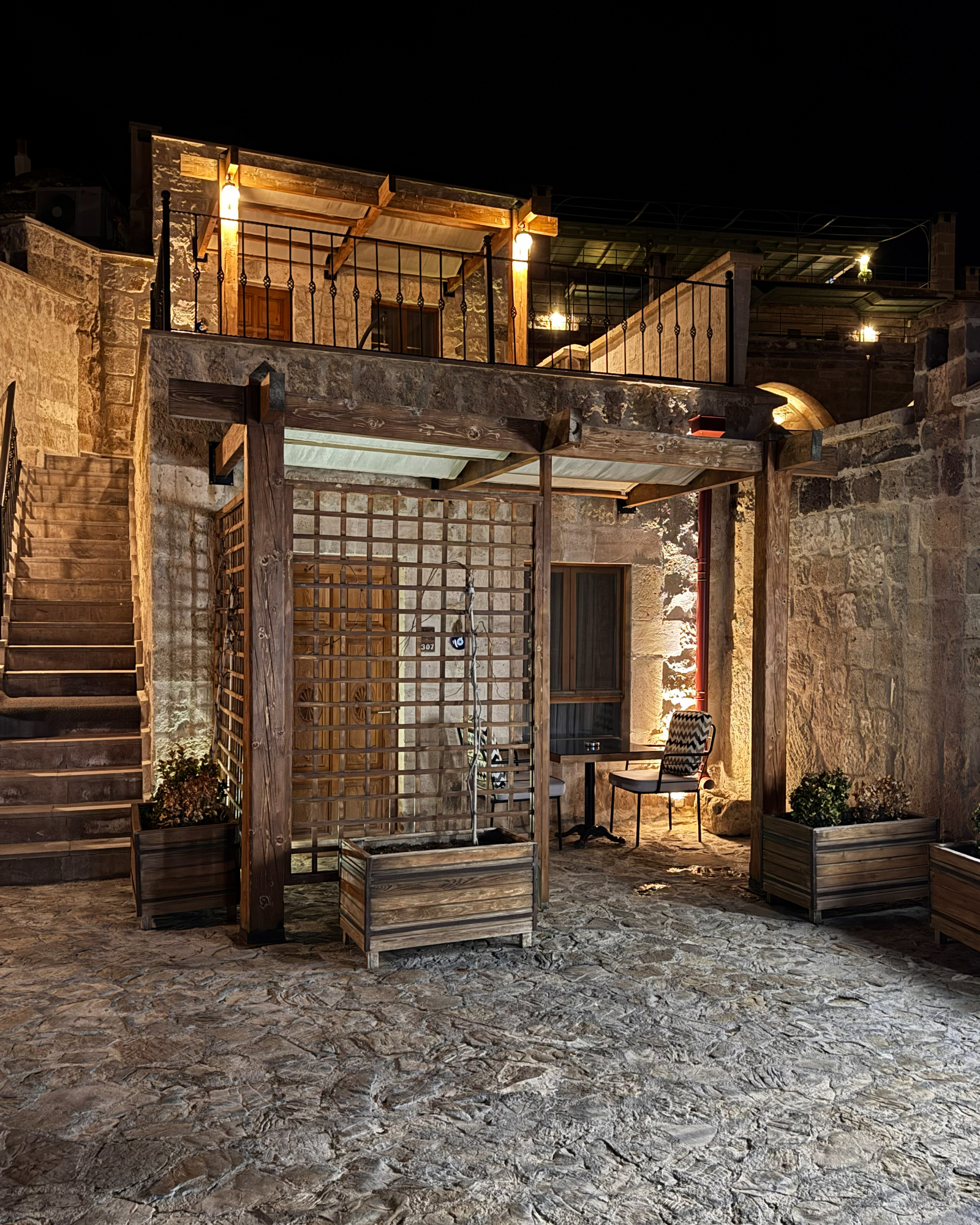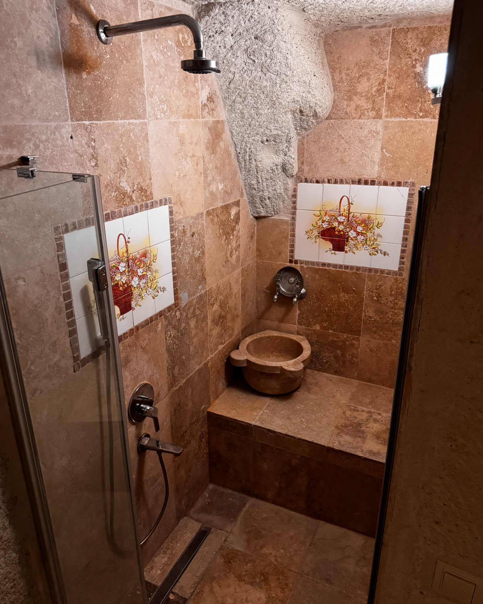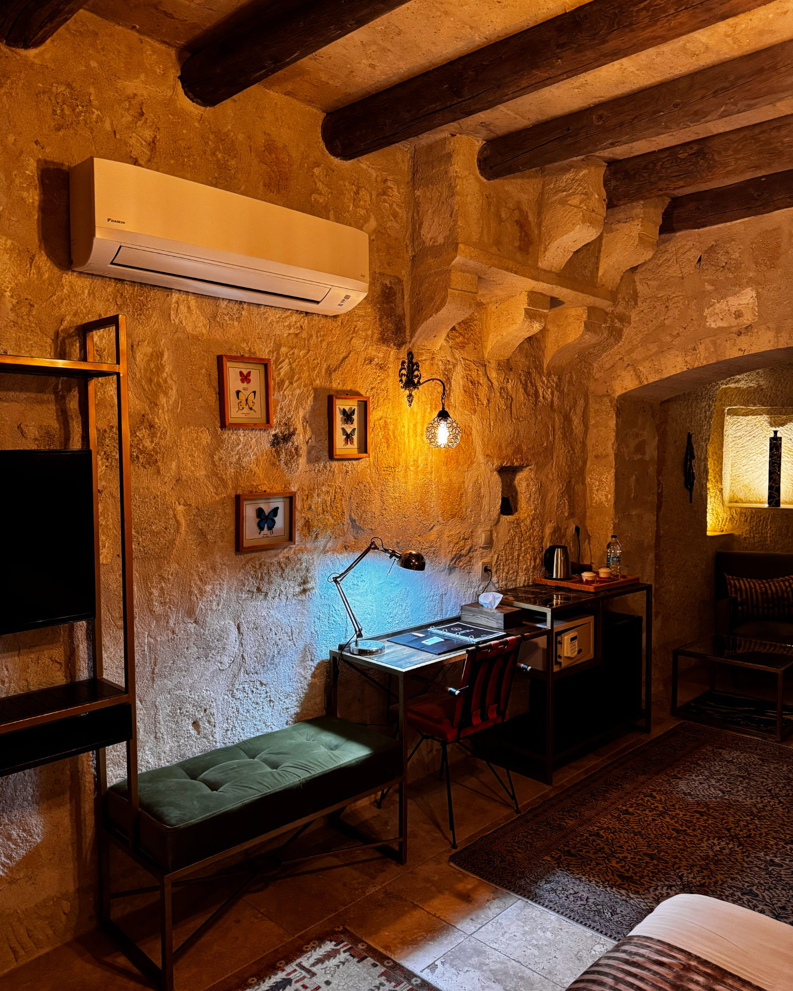 Superior Deluxe Room, teras şöminesi, mini Türk hamamı ve Kapadokya manzarası ile lüks ve otantik bir mağara oda deneyimi sunar.