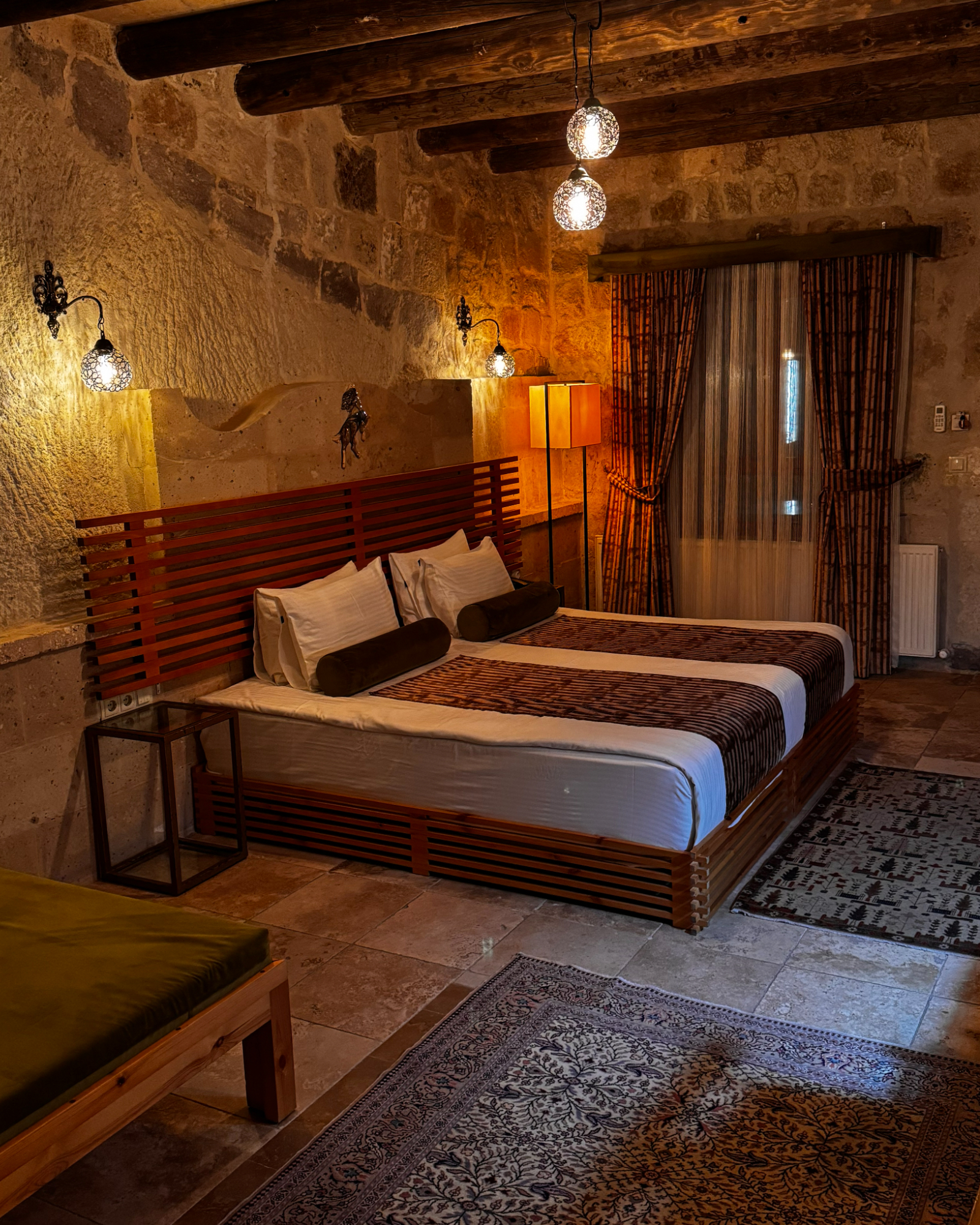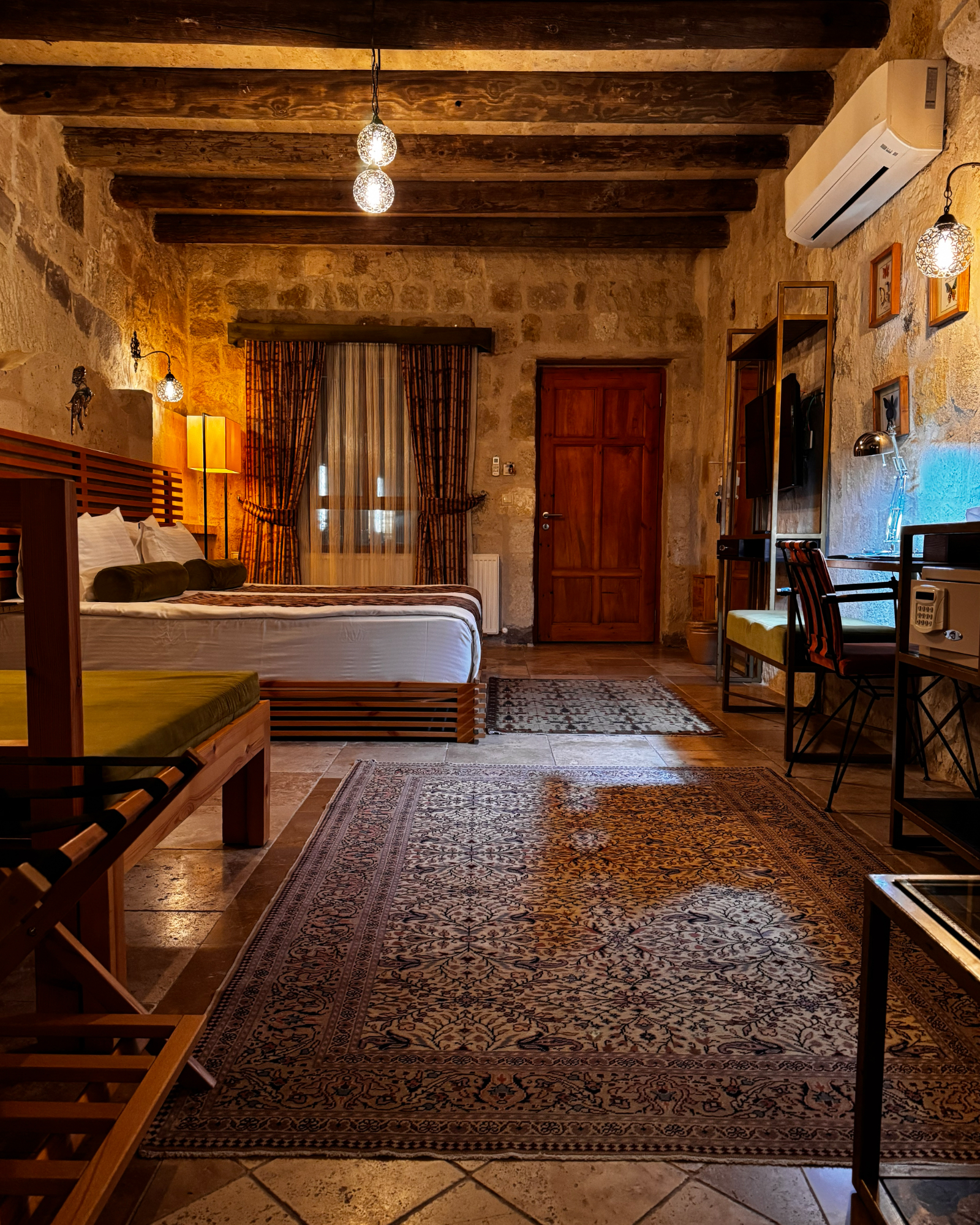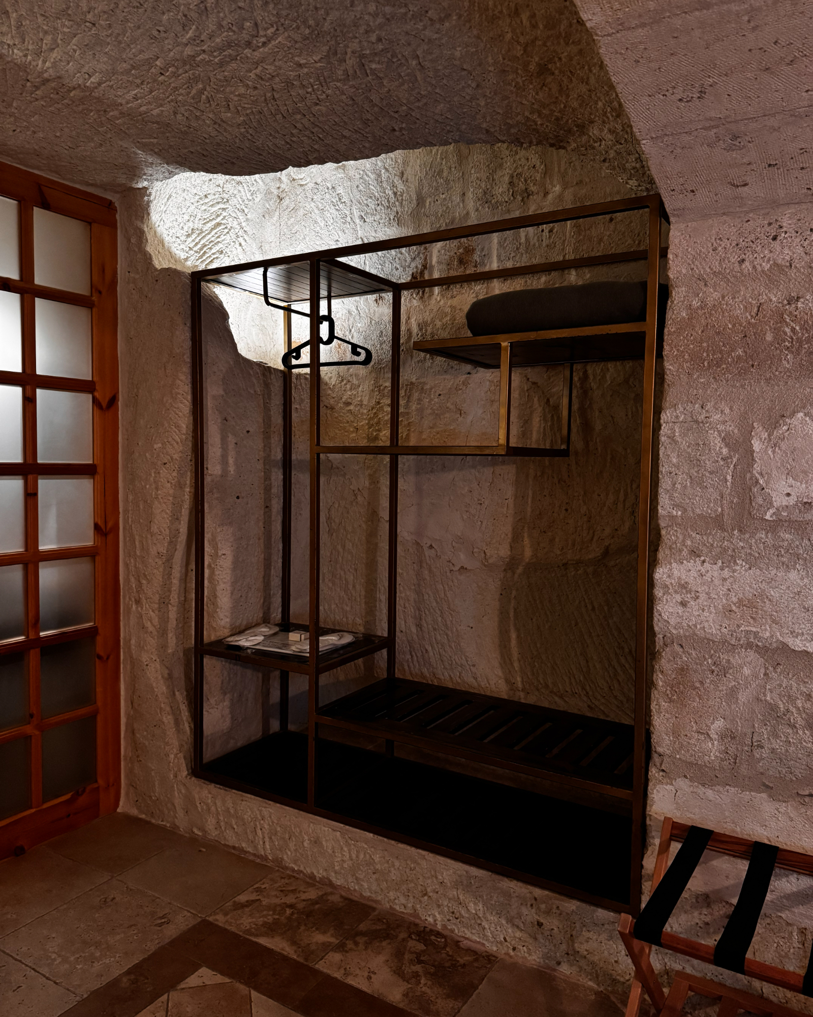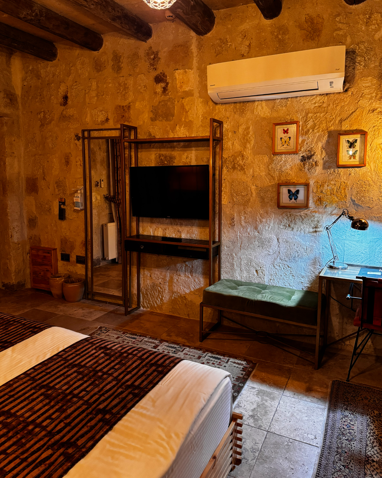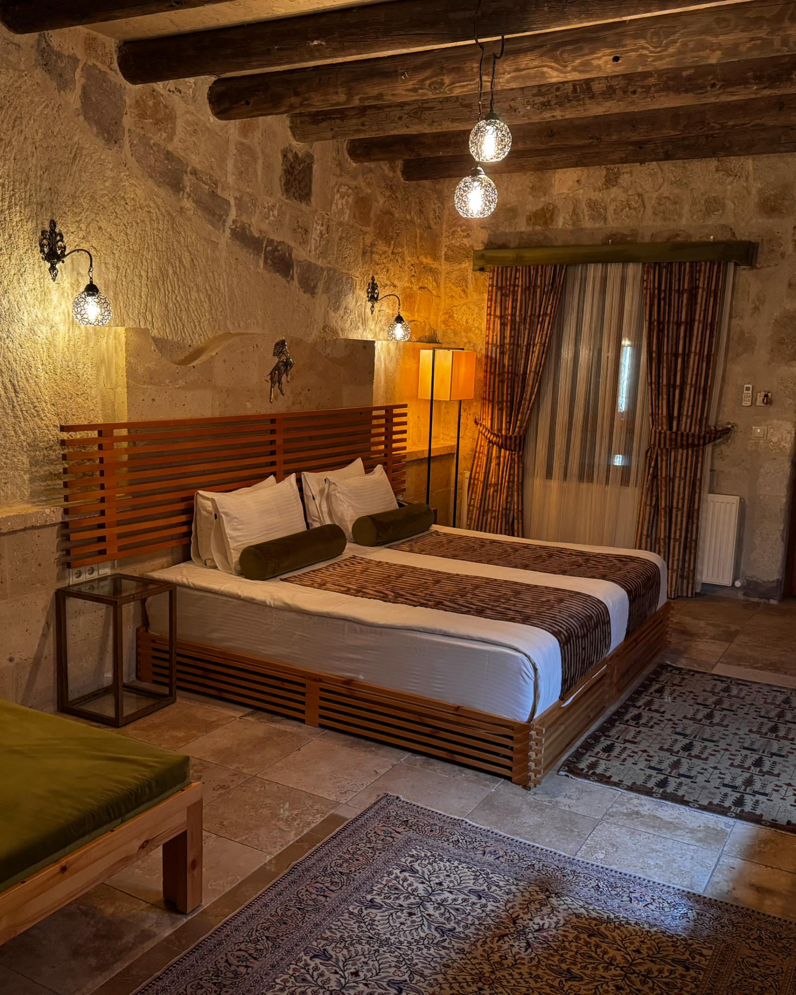 Superior Deluxe Room, teras şöminesi, mini Türk hamamı ve Kapadokya manzarası ile lüks ve otantik bir mağara oda deneyimi sunar.